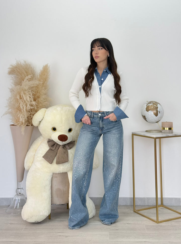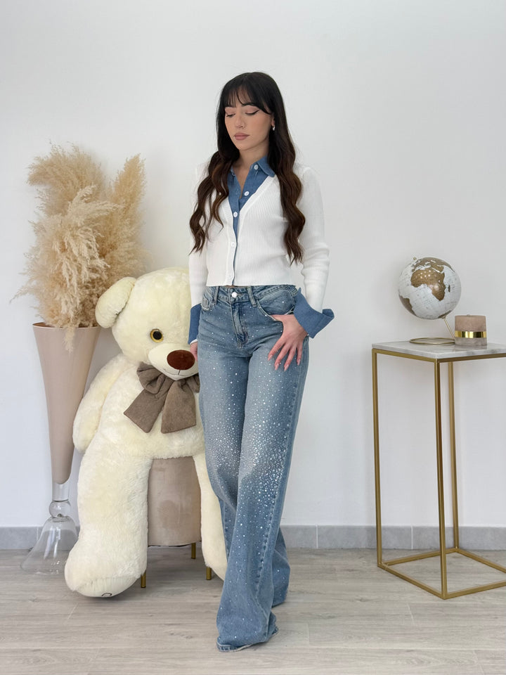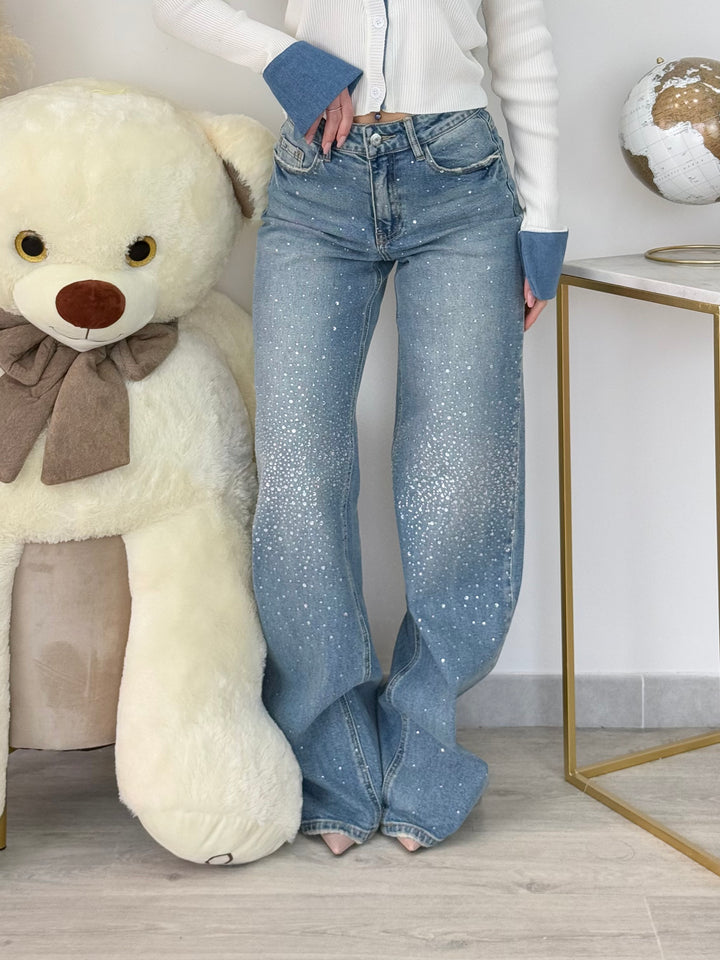 Il Jeans modello wide leg con swaroski ,offre un fit spettacolare . Realizzati in denim di qualità su tela fissa , passanti in vita e chiusura centrale con bottone e cerniera. È ideale per ogni tuo outfit. Vestibiltà regular