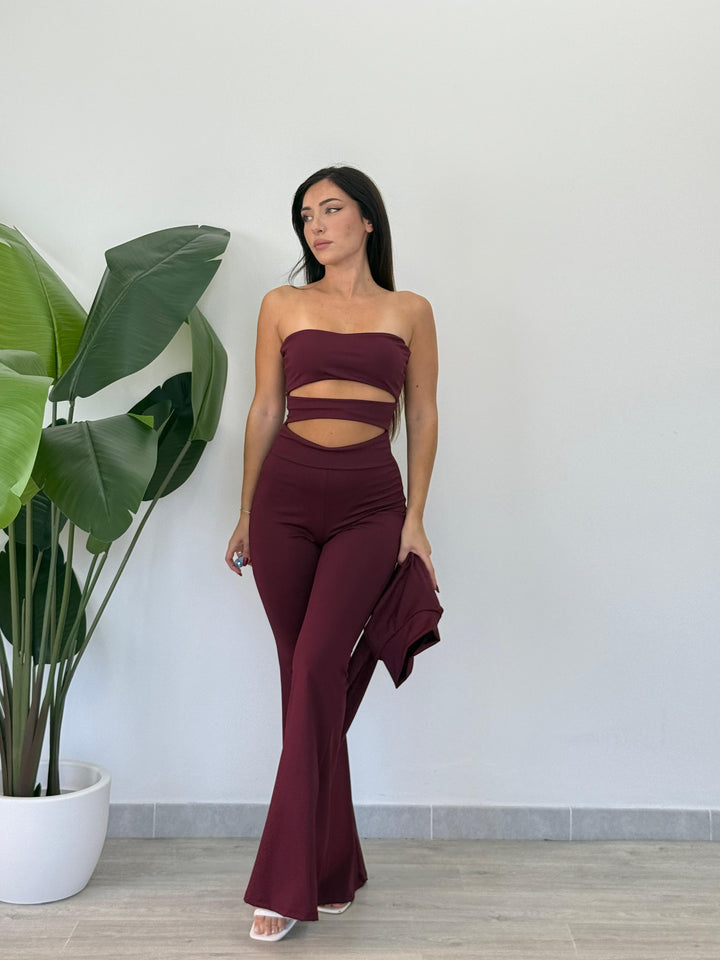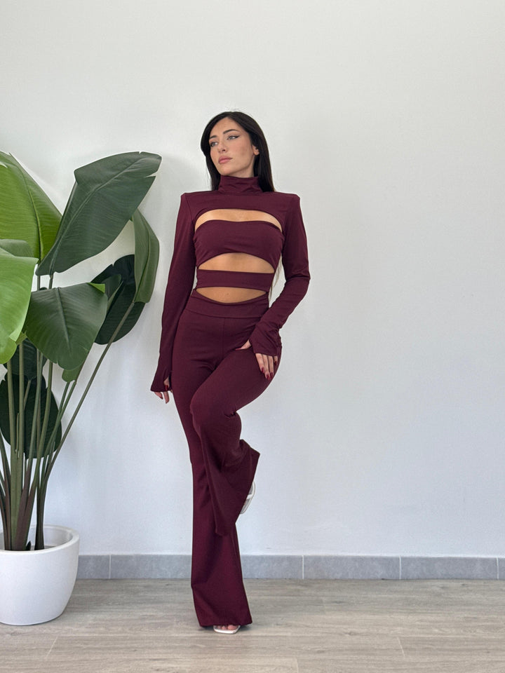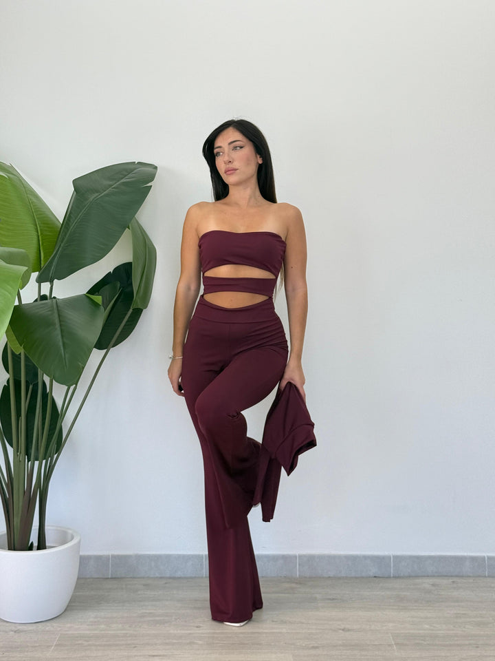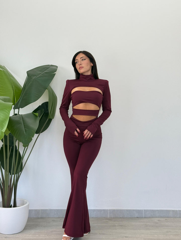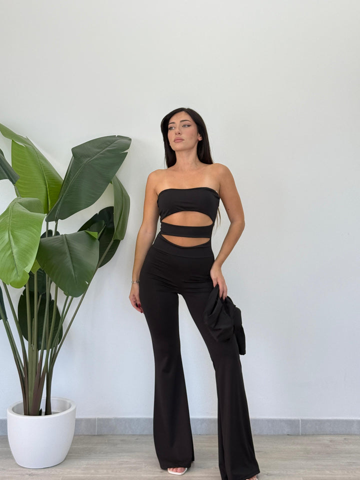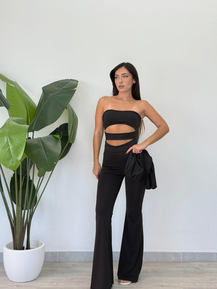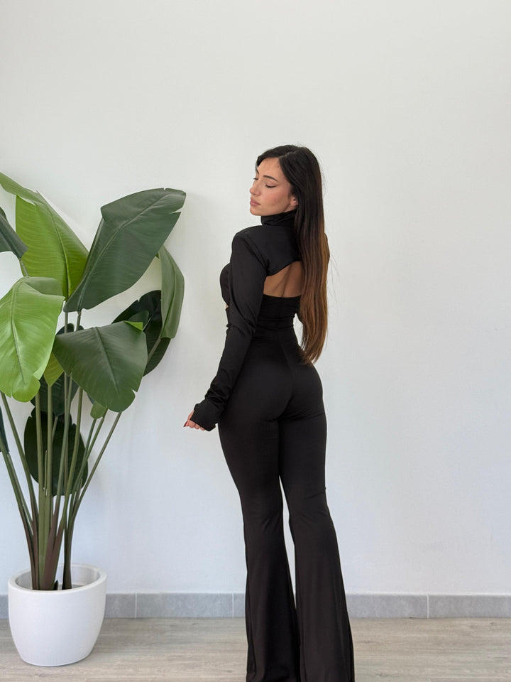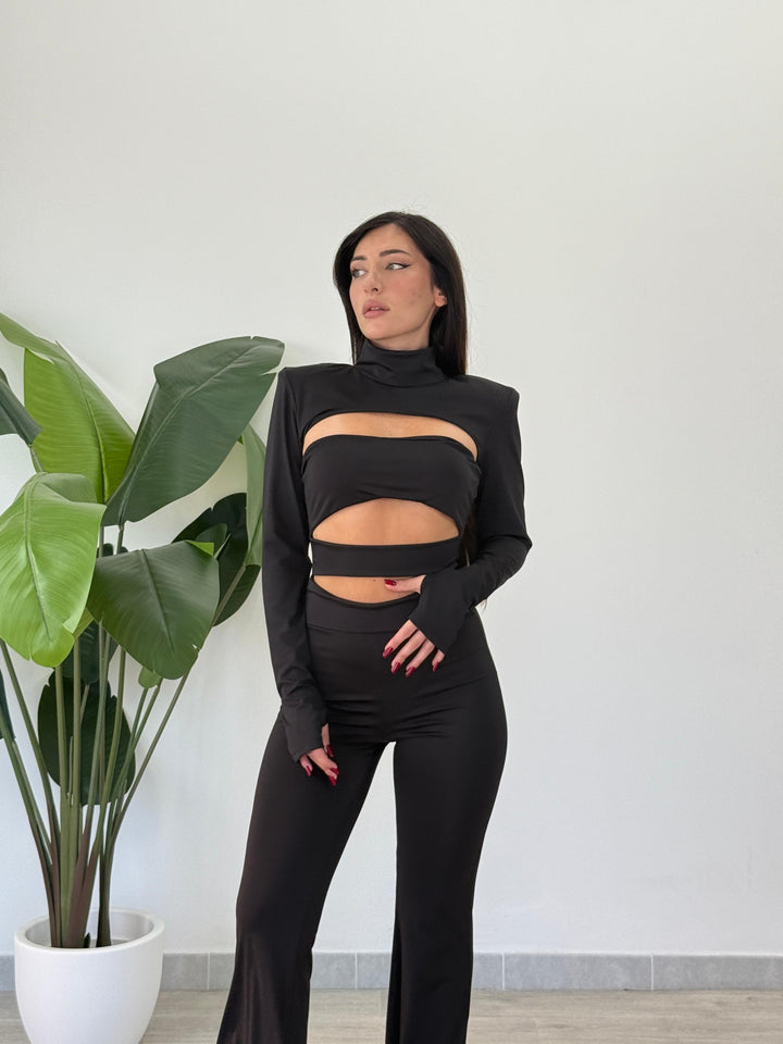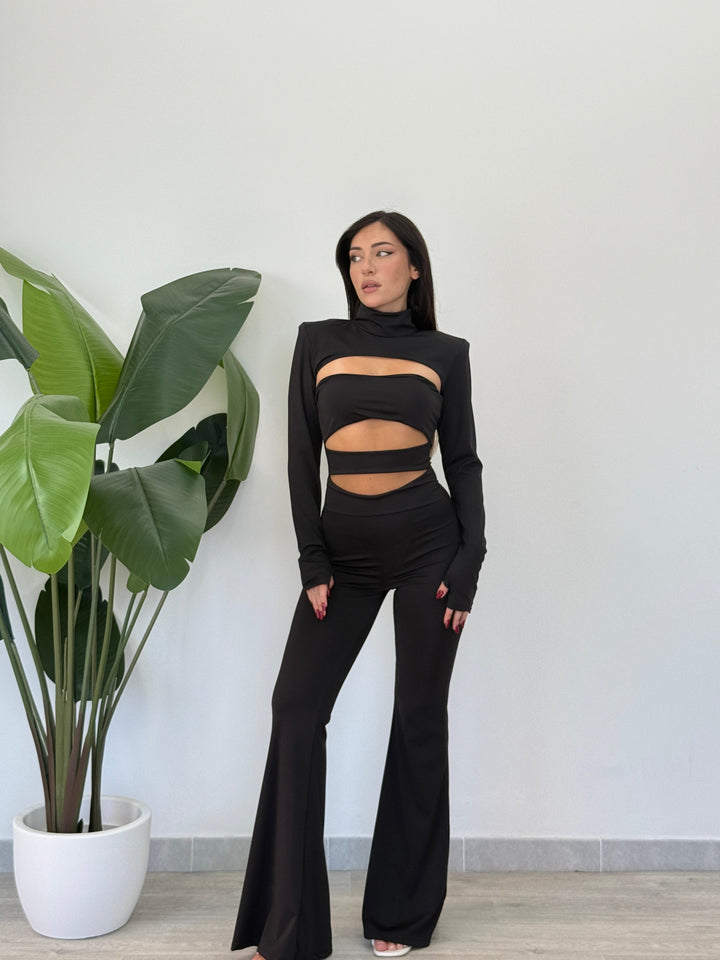Tuta lunga realizzata in licra. Modello a fascia con coppe preformate , cut out sulla pancia e copri spalle in lycra con maniche a guanto ,vestibilitá aderente,ma molto elastica.Perfetta per ogni occasione.Vestibilità elasticizzata.