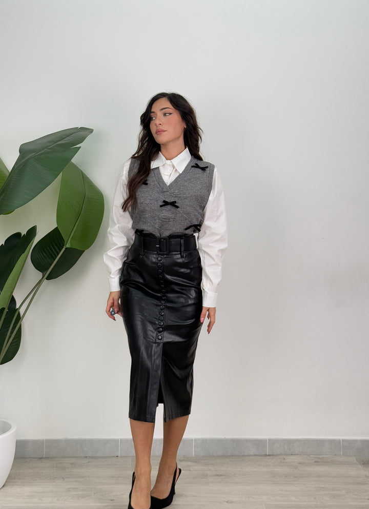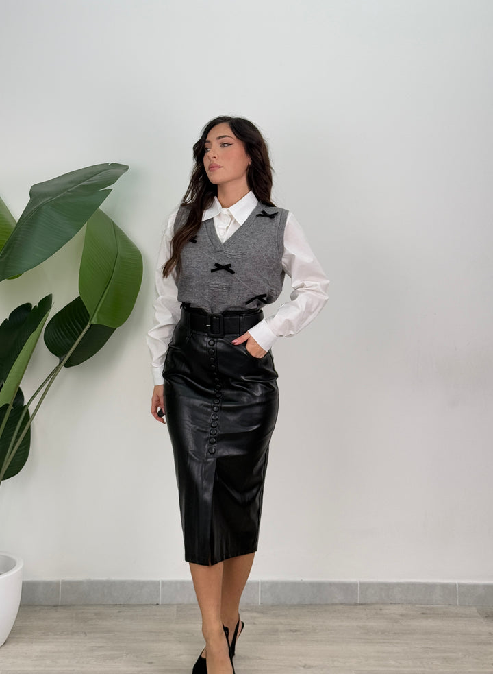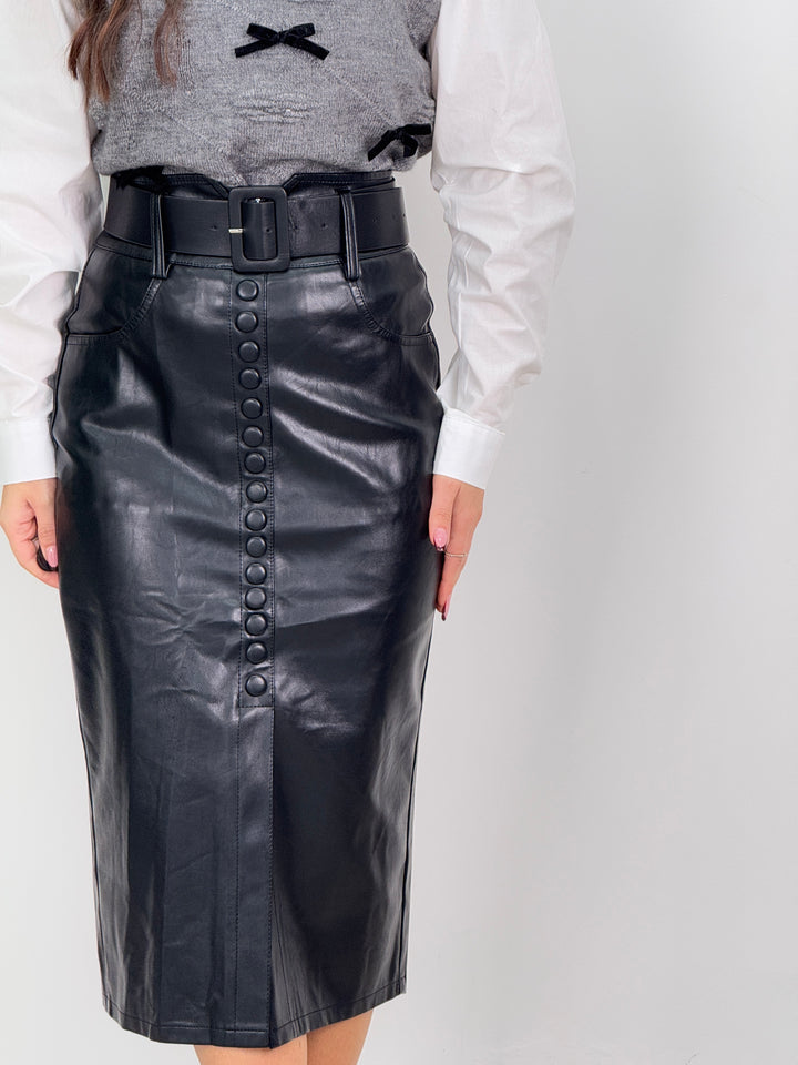 Longuette in ecopelle con bottoni decorativi frontali, tasche laterali e cintura. Taglio aderente al ginocchio che valorizza la silhouette, ideale per qualsiasi tipo di look.