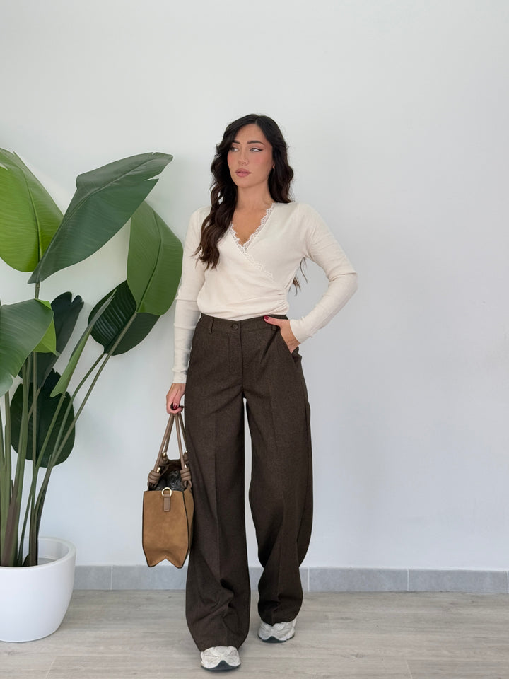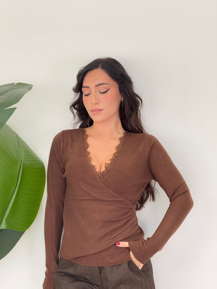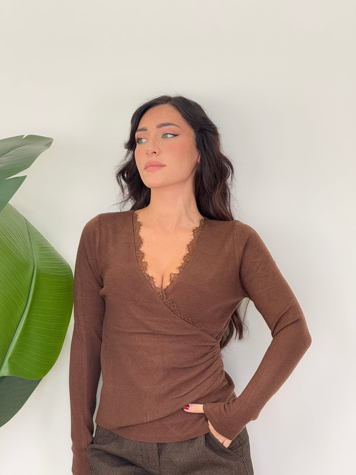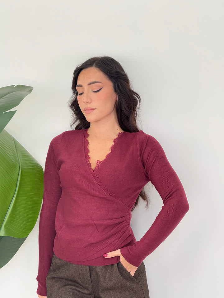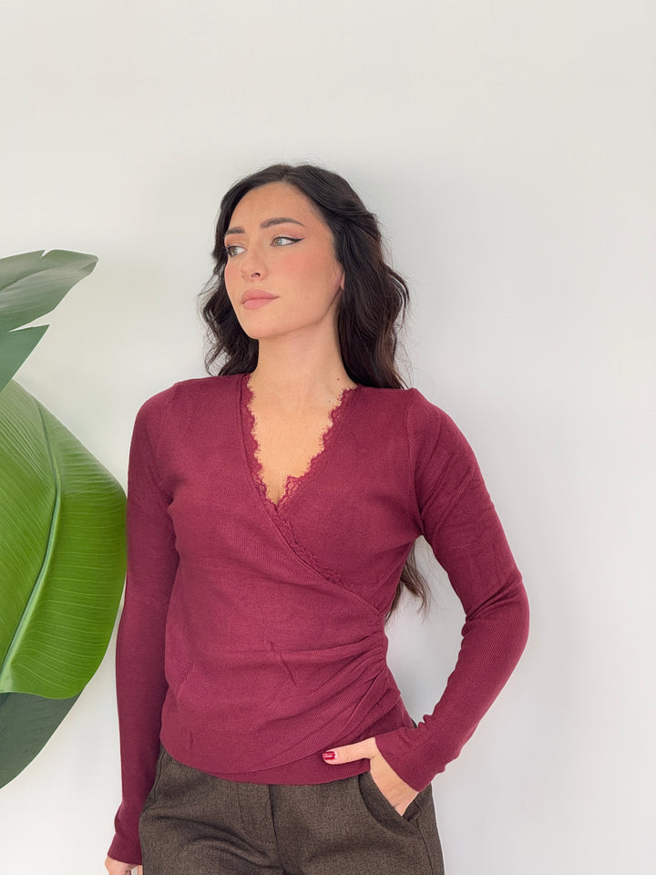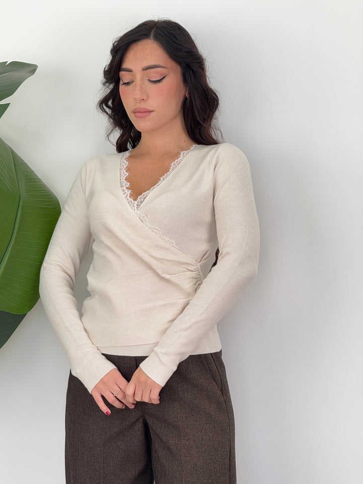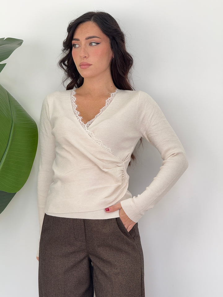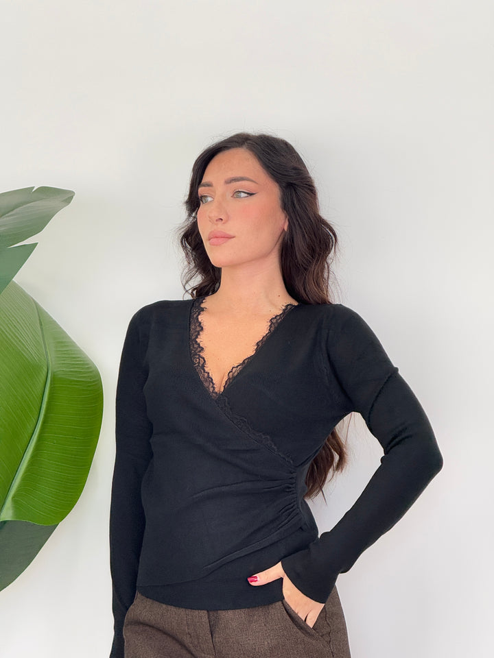Scopri la maglia Desy! Maglia con scollo a V bipordato di pizzo sottile, taglio incrociato sul davanti con arricciatura laterale a manica lunga. Perfetta per ogni tipo di outfit.