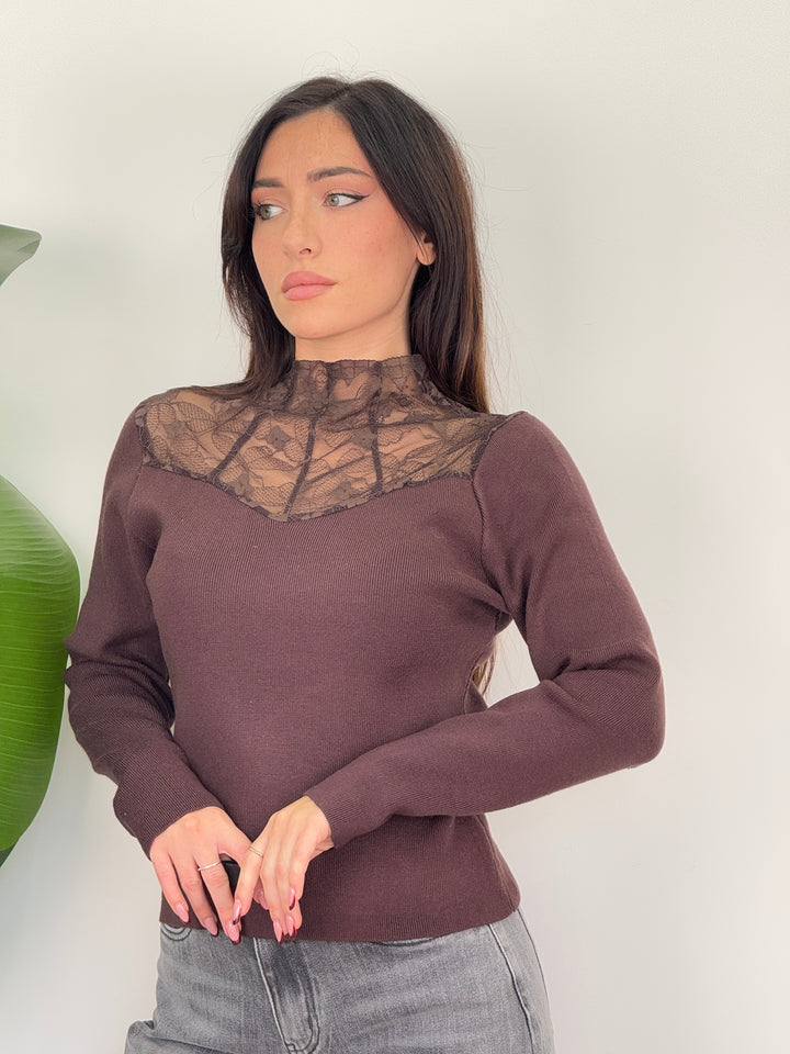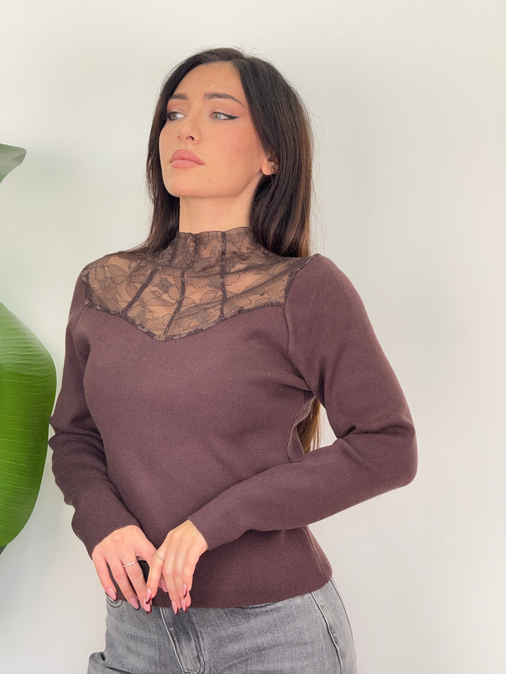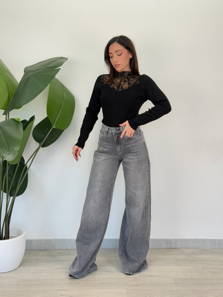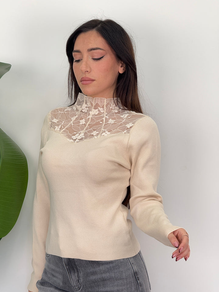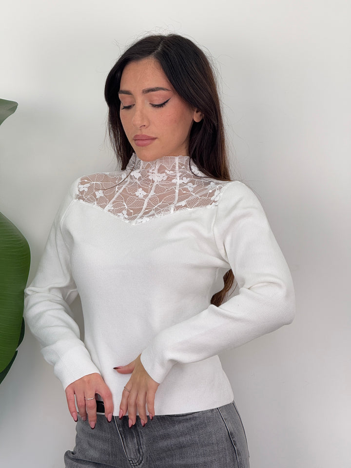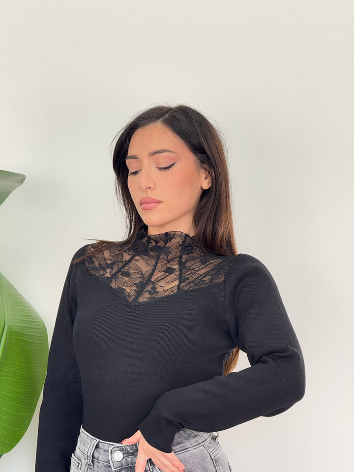 Scopri la maglia Elenoire pizzo! Maglia a maniche lunghe con scollo in pizzo trasparente e motivo floreale, dal taglio elegante e moderno.