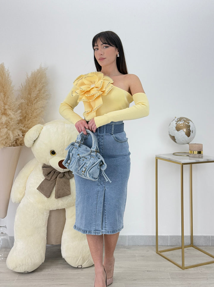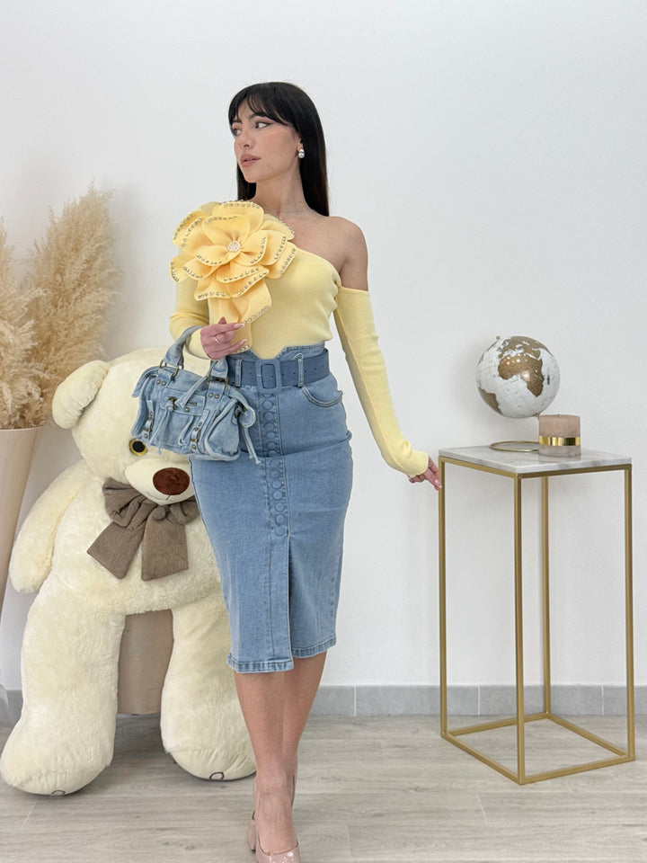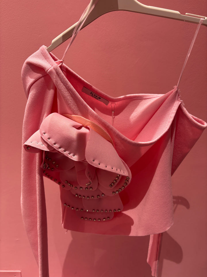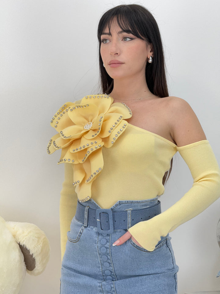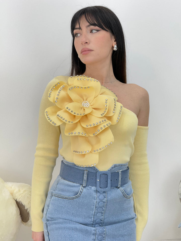 Vieni a scoprire la Magnifica maglia Flora. Modello monospalla realizzato in puro cotone (Made in Italy ) con maxi fiore e applicazioni di gioielli sui petali. Non può assolutamente mancare questa meraviglia nel tuo guardaroba.Perfetta per qualsiasi outfit .Vestibilità elasticizzata