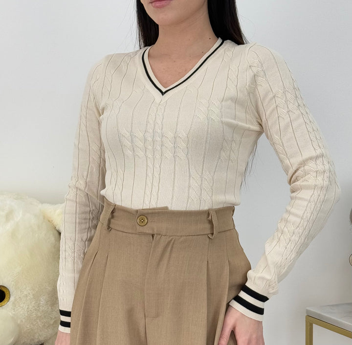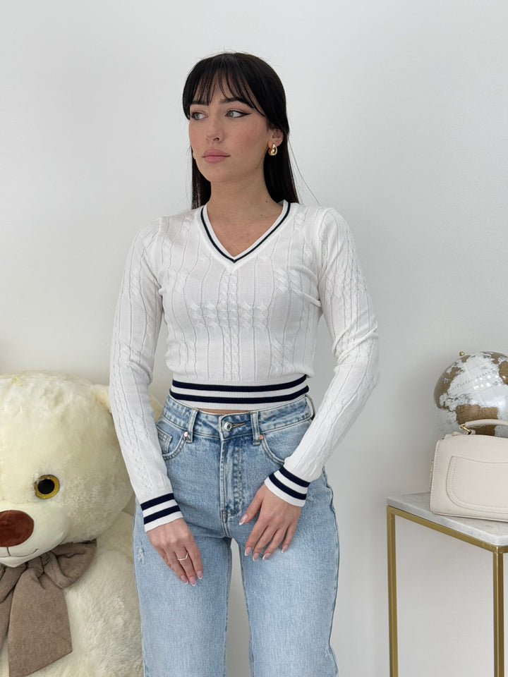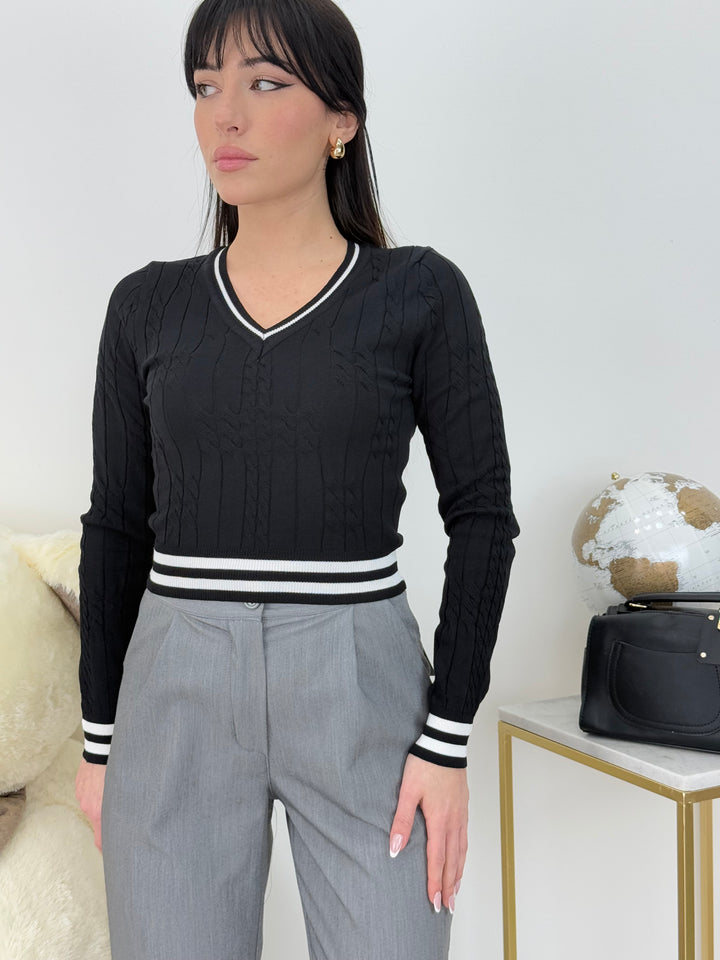 Maglia crop realizzata in cotone con maniche lunghe con scollo a v ,presenta dettagli a contrasto ; è la scelta perfetta per un look alla moda ,irresistibilmente confortevole. Comoda e pratica, vestibilitá aderente .