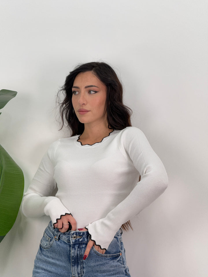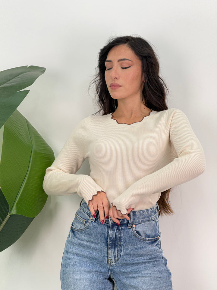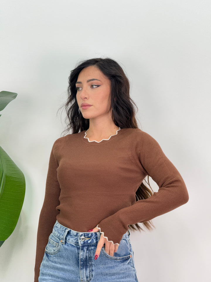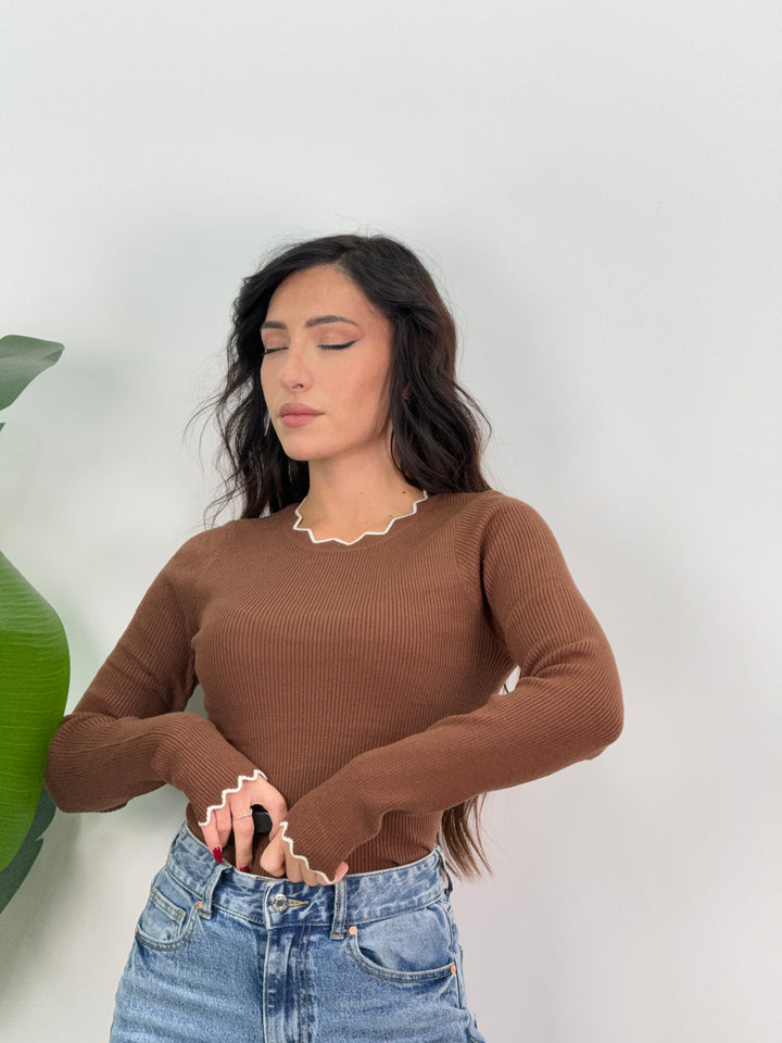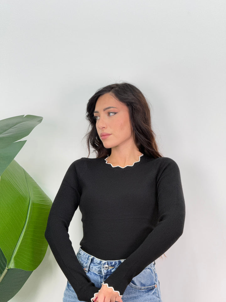 Maglia a costine realizzata in morbida lana pettinata che la rende particolarmente calda .Modello girocollo con maniche lunghe con bordini a contrasto .Perfetta per rendere ogni tuo outfit Unico! Vestibilità elasticizzata.