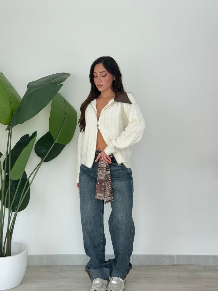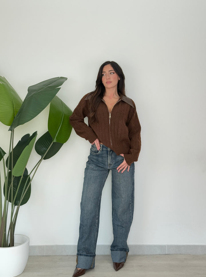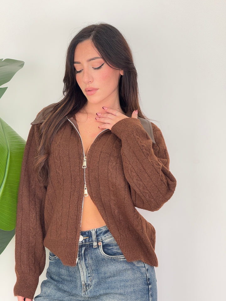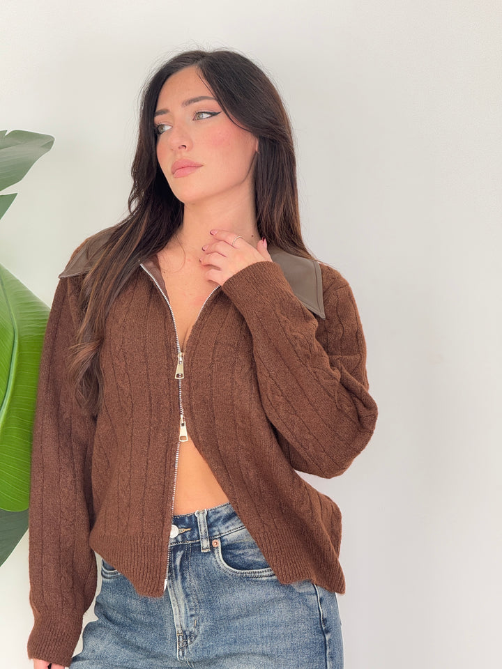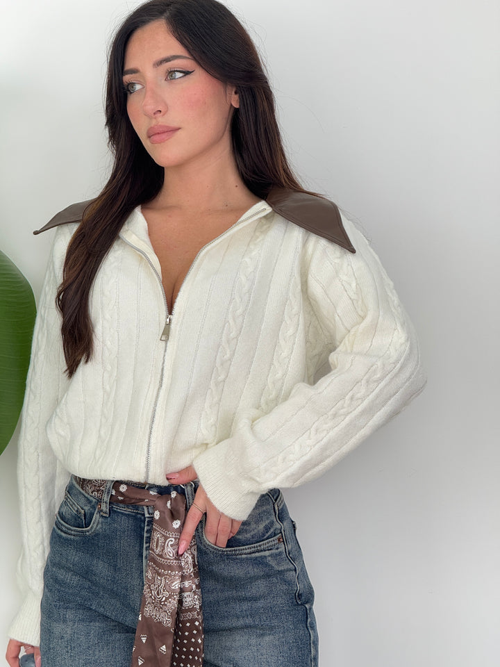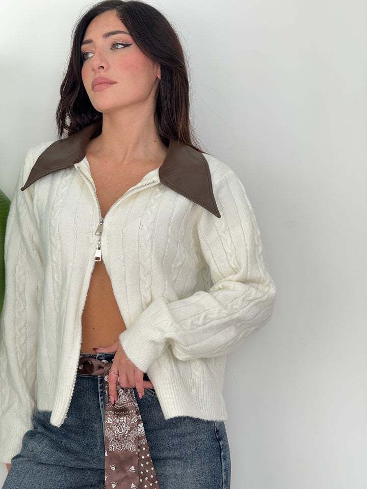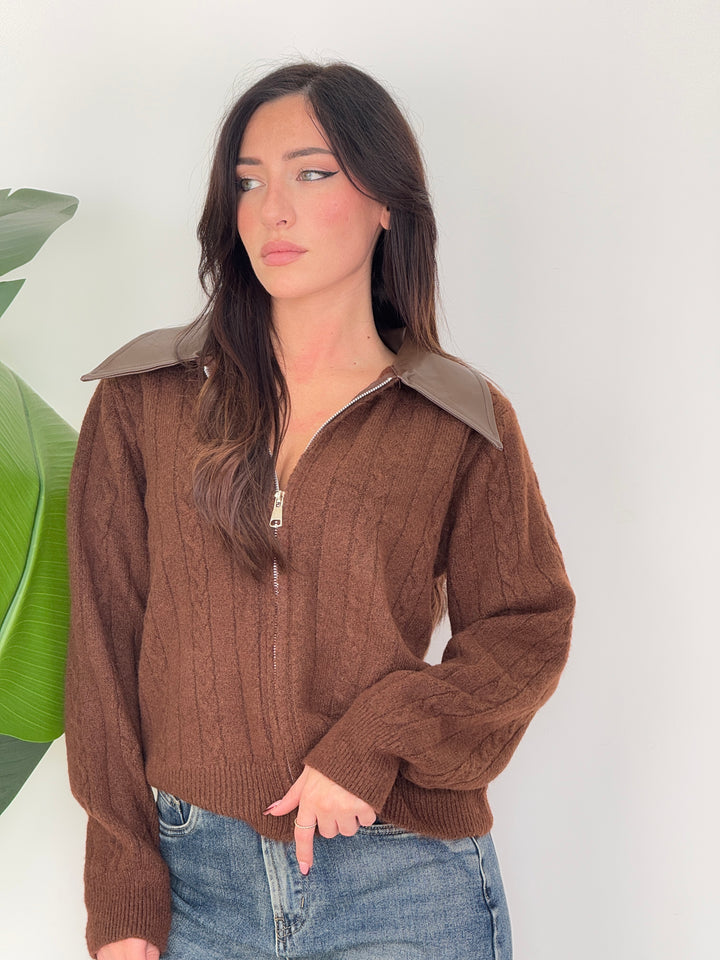 Scopri la maglia Letizia! Maglia chiusura a zip frontale. Presenta un ampio colletto in ecopelle marrone a contrasto. Ideale per un look casual.
