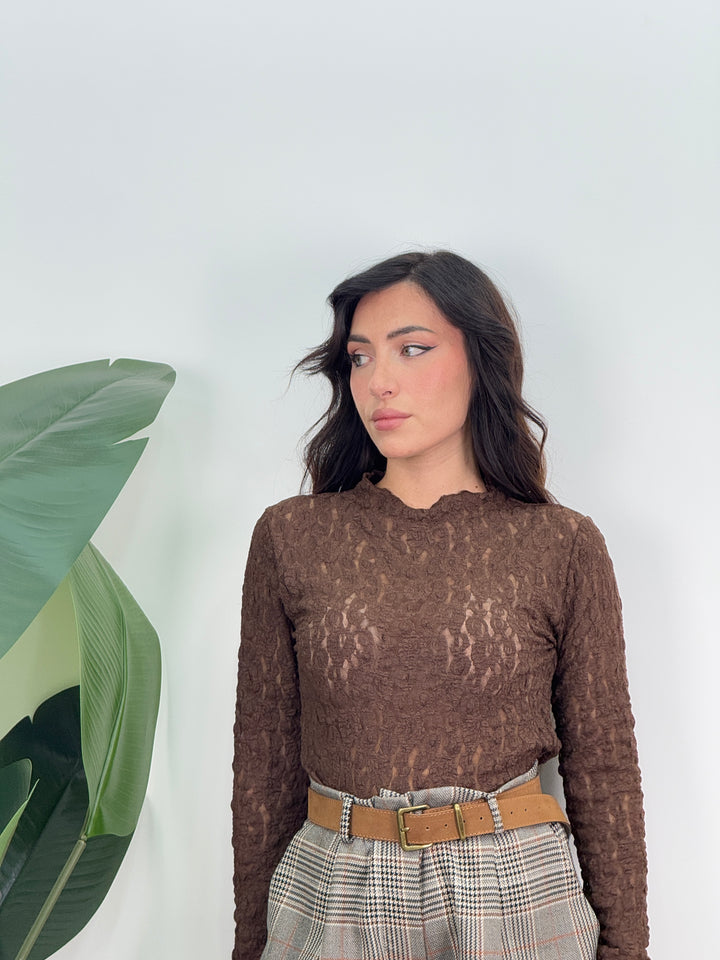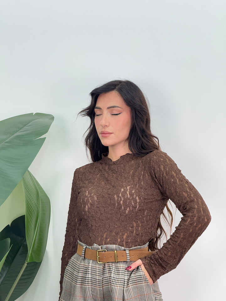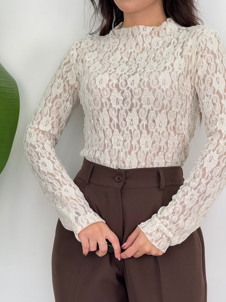 Maglia in pizzo floreale, maniche lunghe, taglio aderente leggermente trasparente. Ideale per ogni tuo outfit!