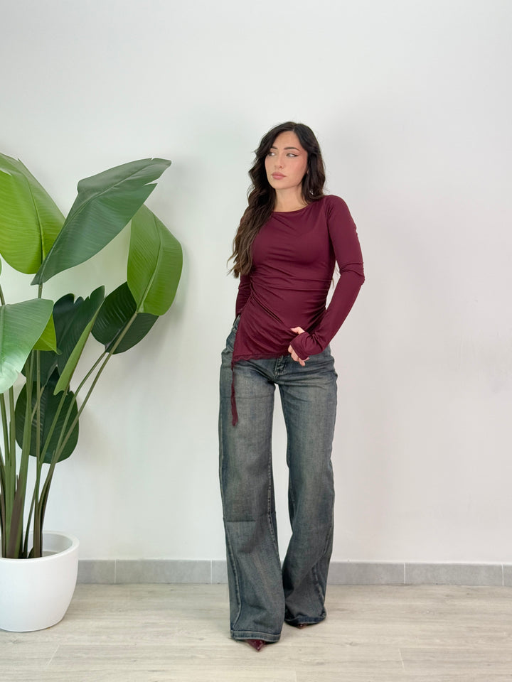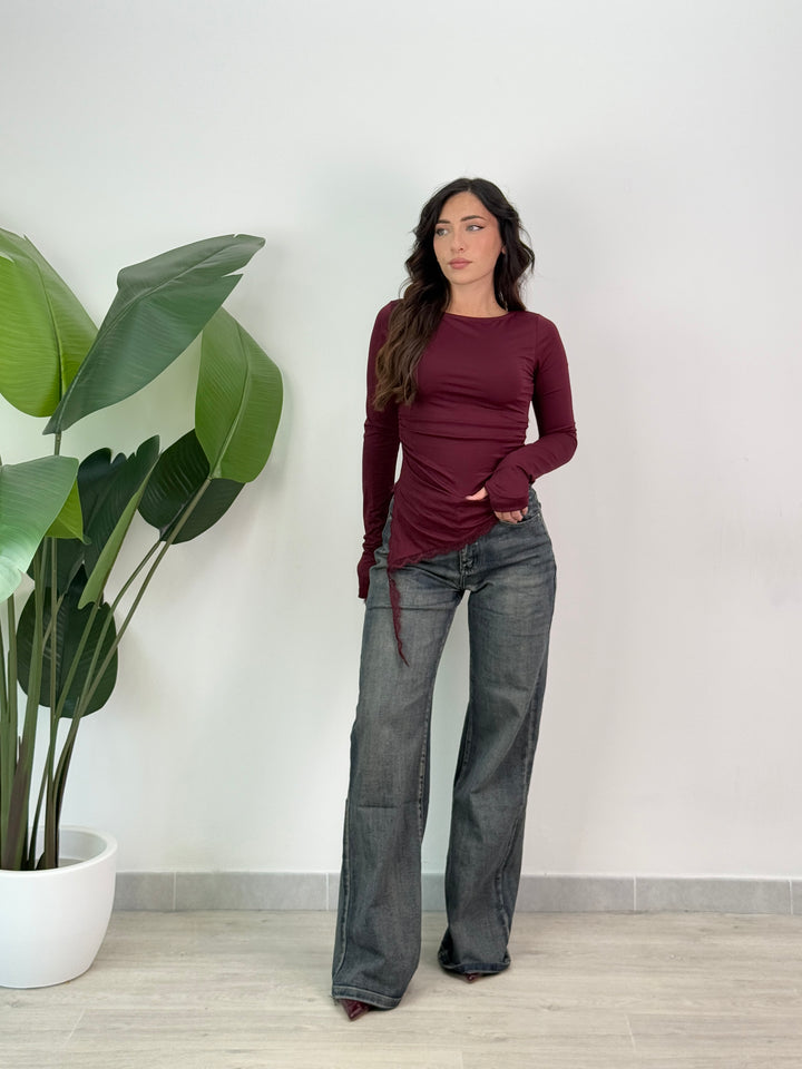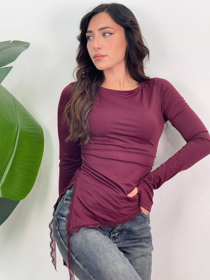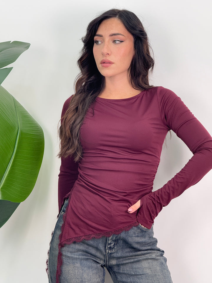 Maglia pizzo asimmetrica elasticizzata con maniche lunghe e scollo tondo, caratterizzata da orlo asimmetrico con bordo in pizzo e leggere arricciature laterali. Ideale per qualsiasi outfit