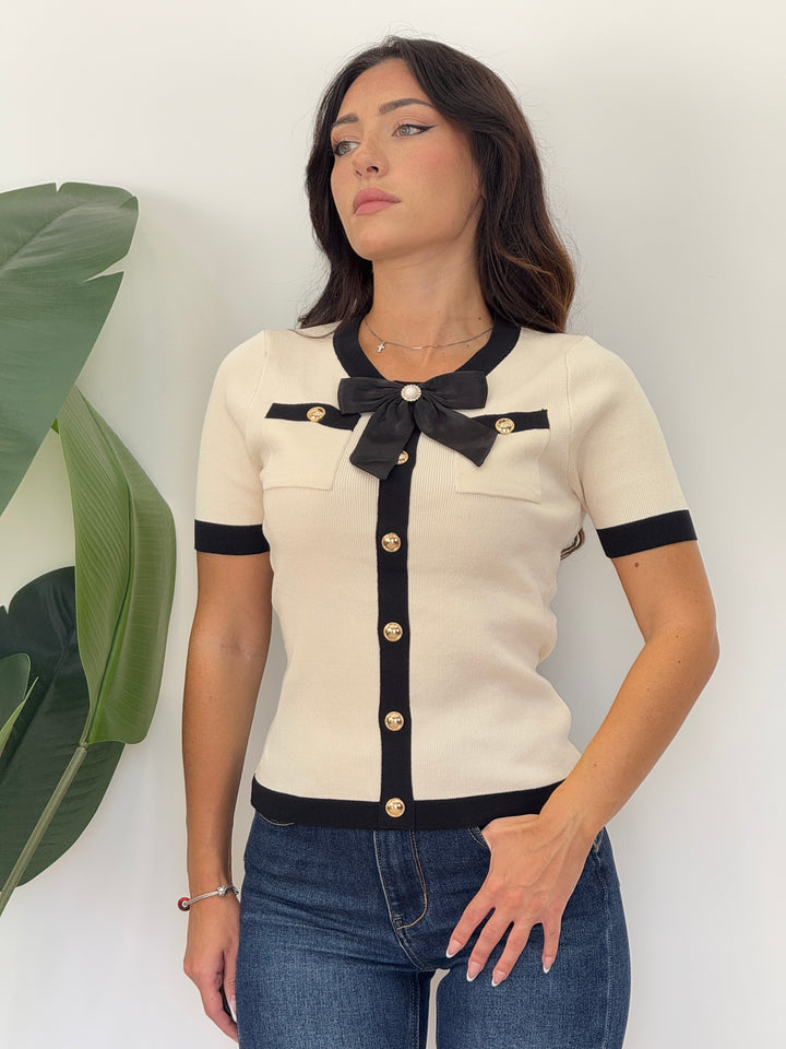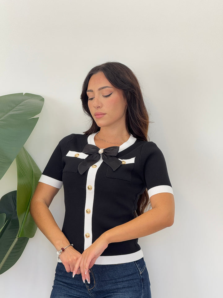 Maglia a maniche corte, dallo stile elegante, con bordature nere su collo e abbottonatura centrale. È arricchita da bottoni dorati frontali e da un grande fiocco nero applicato sotto il collo, che dona un tocco raffinato e femminile.