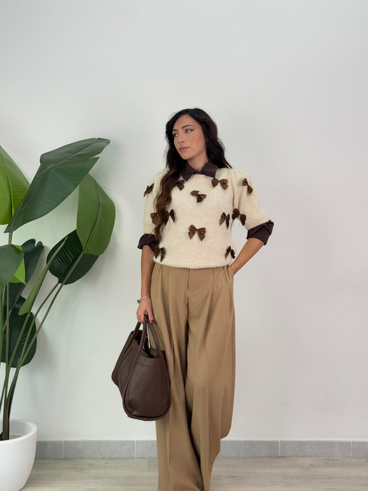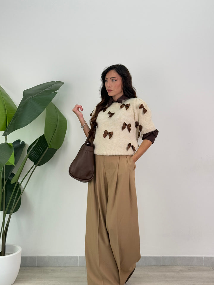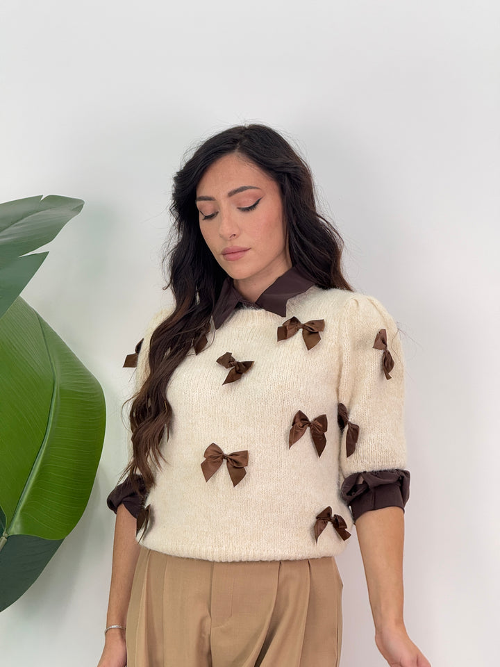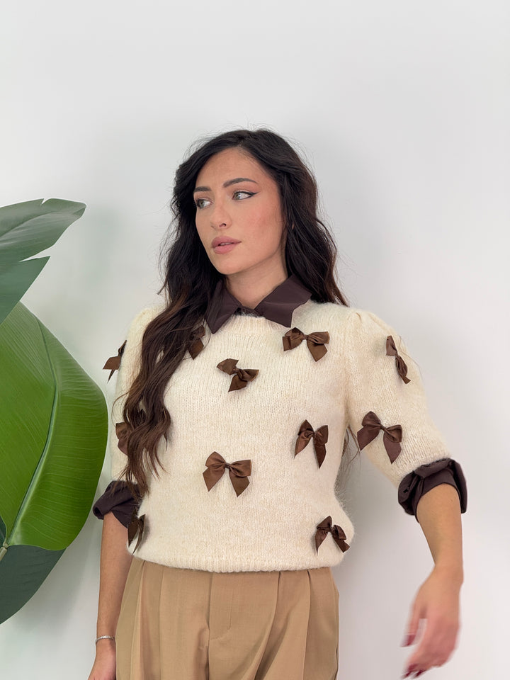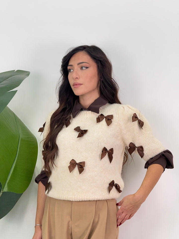 Maglioncino con fiochetti in rilievo realizzato in morbida lana .Modello girocollo con maniche corte e spalle leggermente ribassate;.Vestibilità elasticizzata