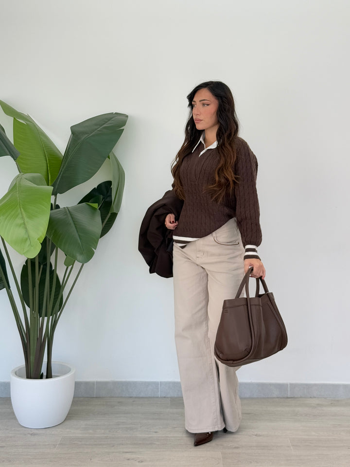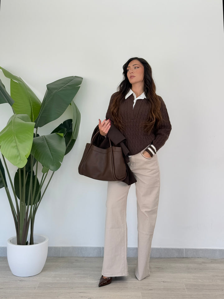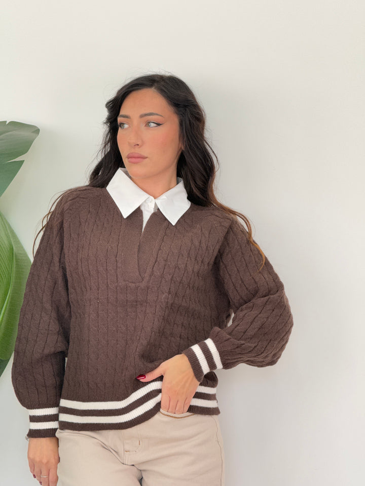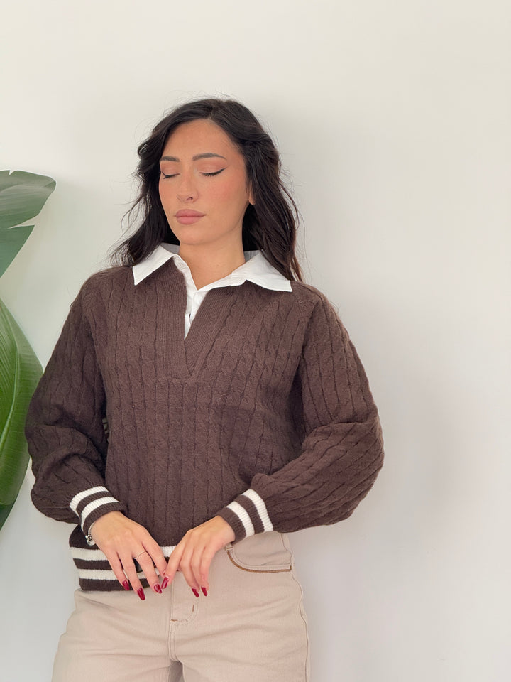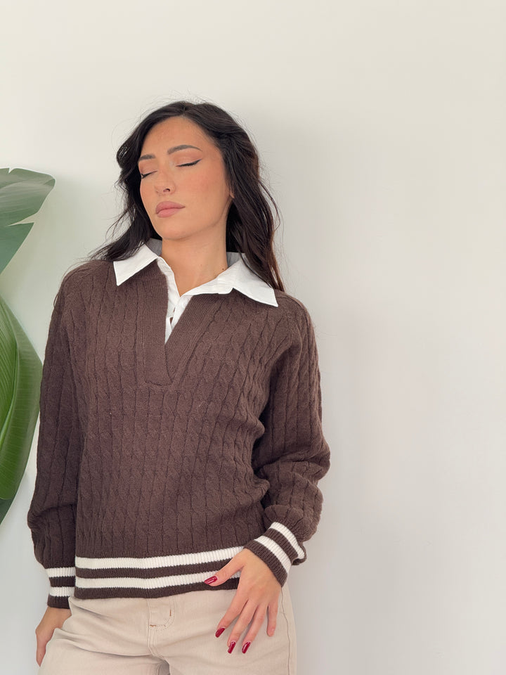 Maglioncino realizzato in morbida lana che lo rende particolarmente caldo.Modello scollo a V con camicia; ; maniche lunghe .Perfetto per qualsiasi outfit ,non può mancare assolutamente nel tuo guardaroba.Vestibilitá elasticizzata regular.