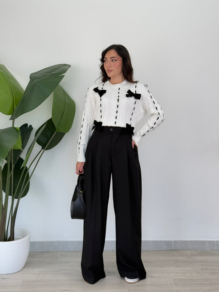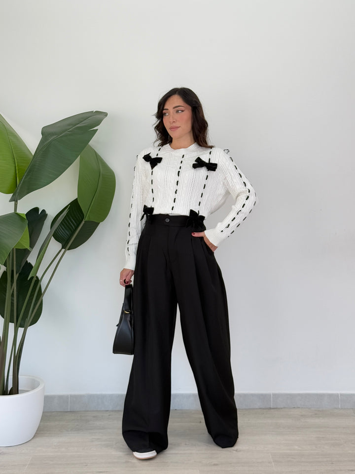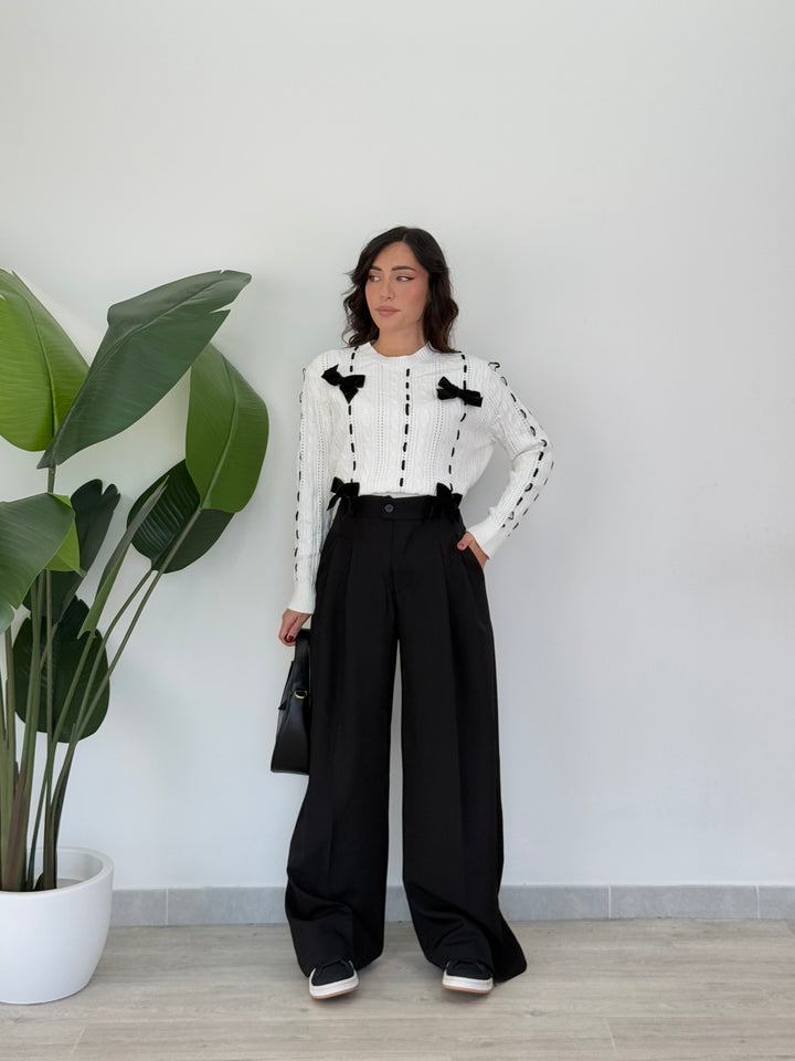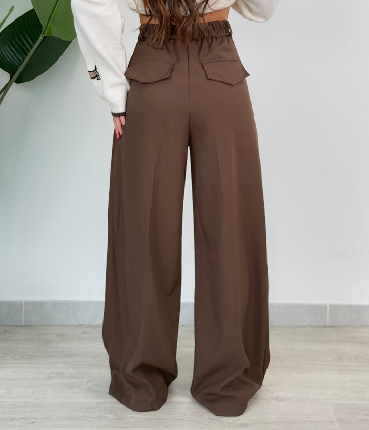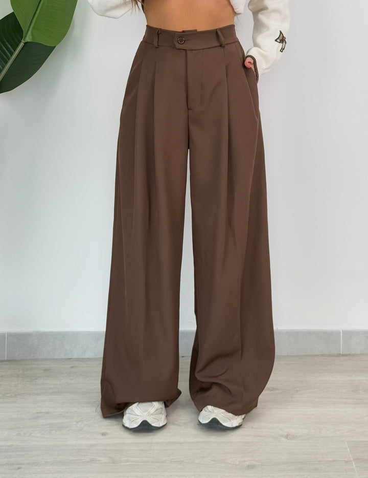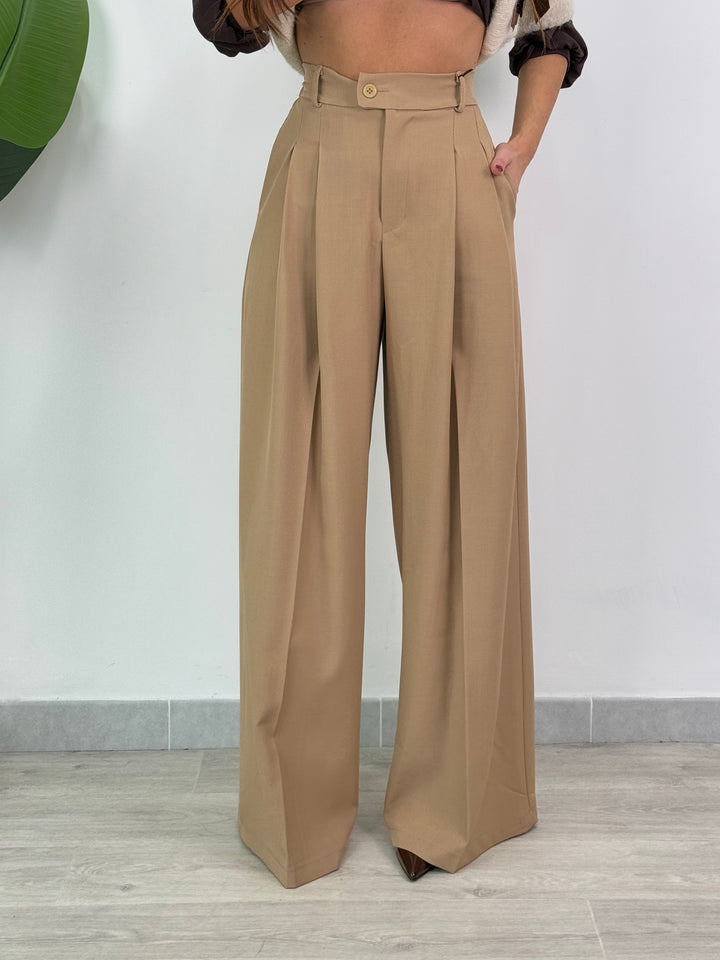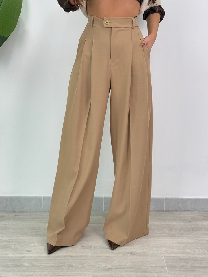 Vieni a scoprire il pantalone Anitta. Modello gamba larga con elastico sul retro, doppio pliegue, bottone laterale, zip e passanti in vita . Perfetto per qualsiasi outfit.
