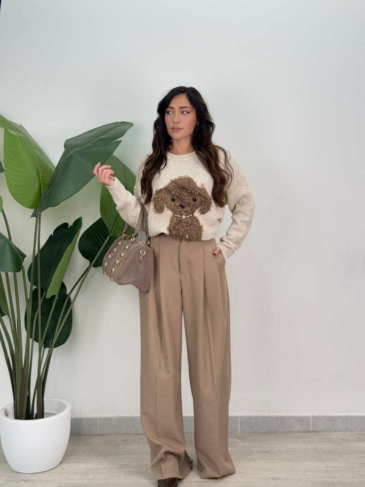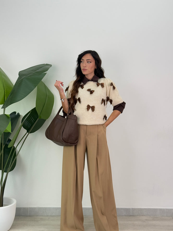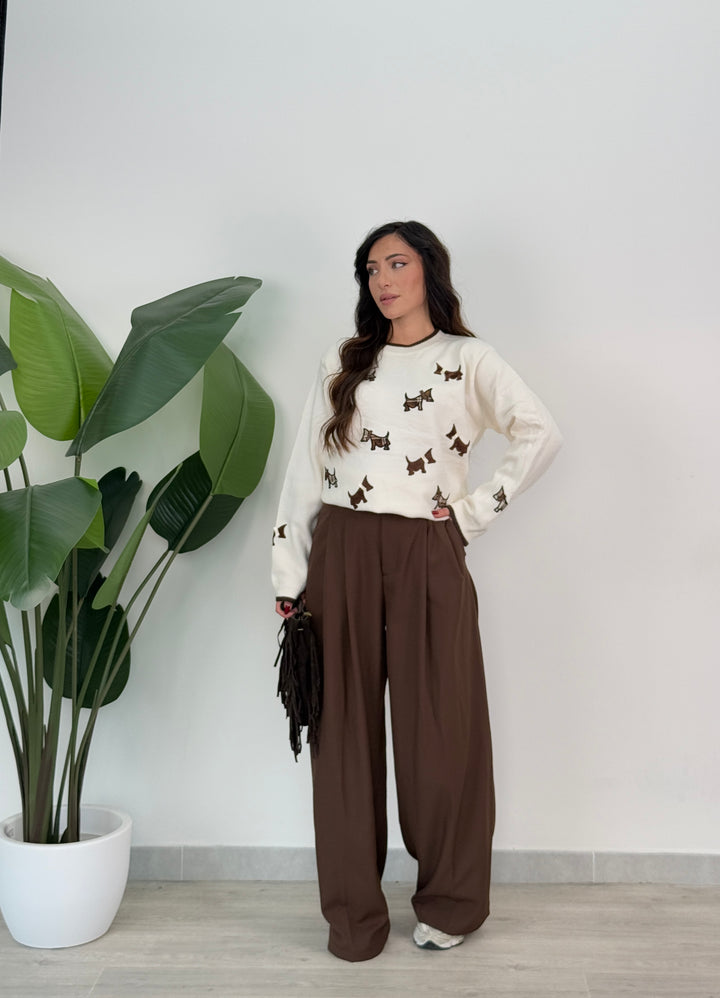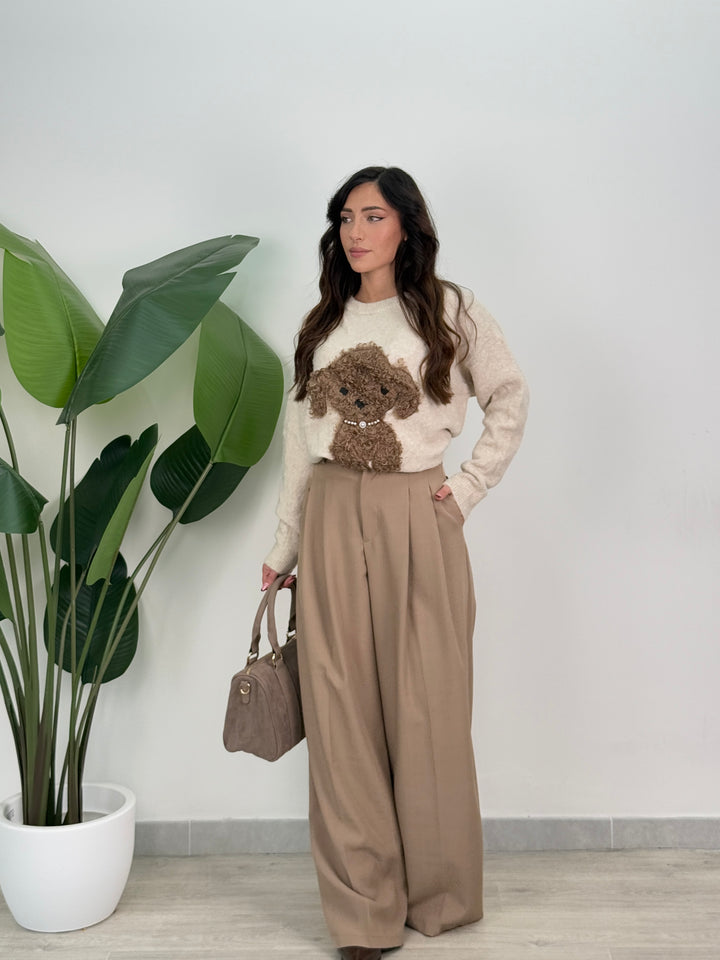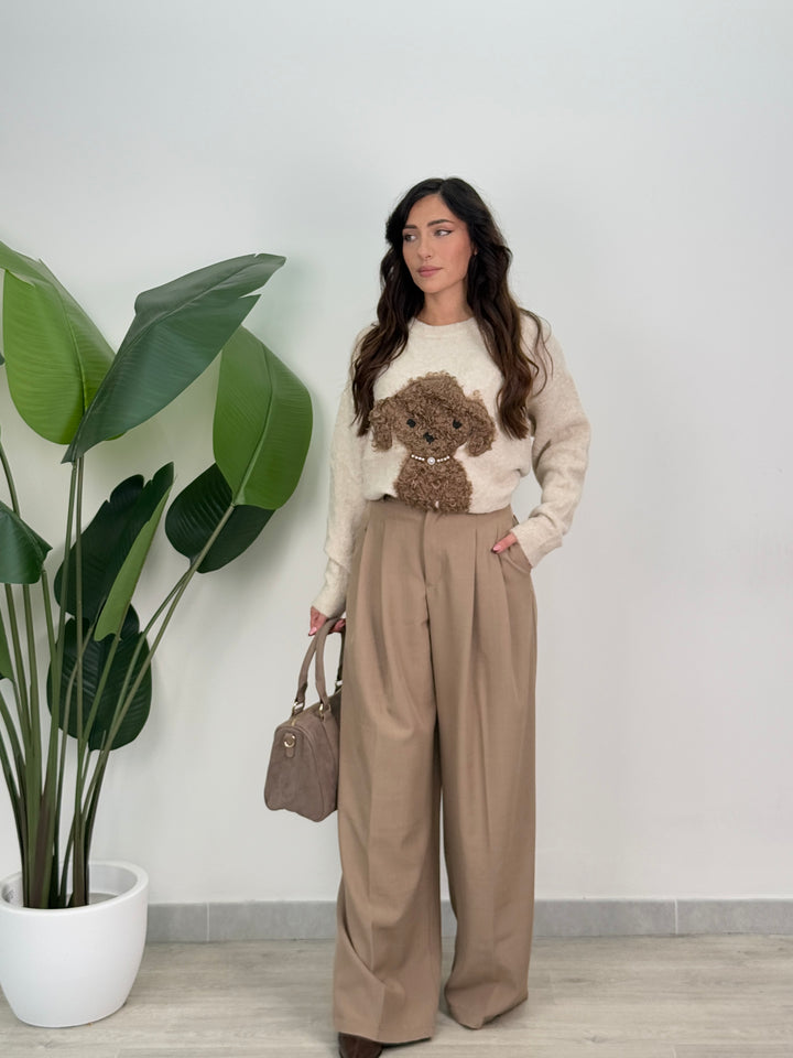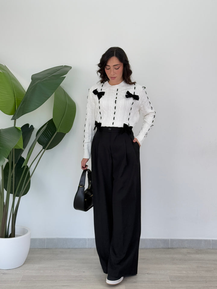 Vieni a scoprire il pantalone Anitta. Modello gamba larga con elastico sul retro, doppio pliegue, bottone laterale, zip e passanti in vita . Perfetto per qualsiasi outfit.