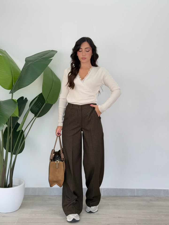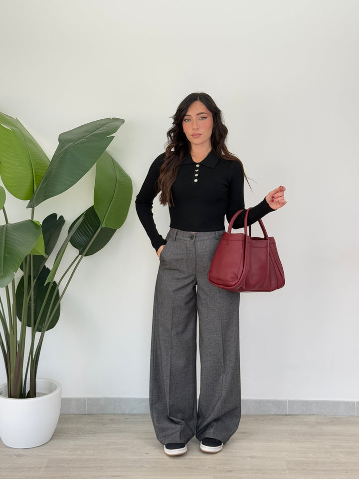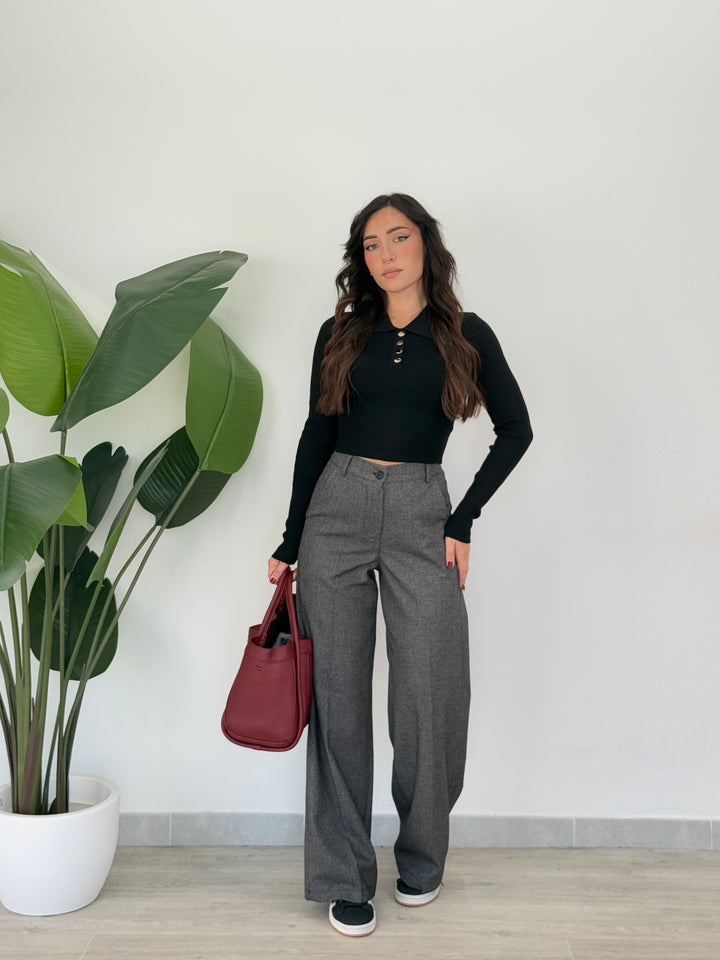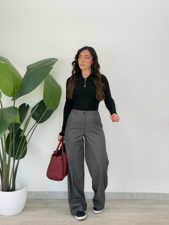 Scopri il pantalone Ava! Pantalone modello palazzo, a vita alta con passanti in vita e bottone. Ideale per creare un look sempre alla moda! Uno stile esclusivo ed unico per qualsiasi occasione.