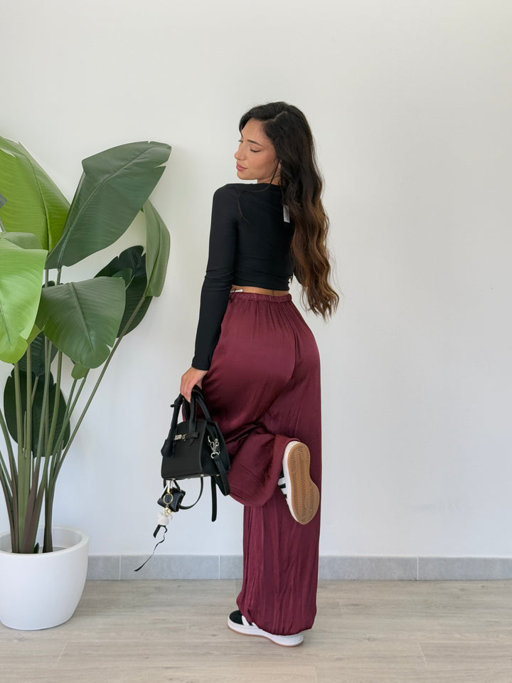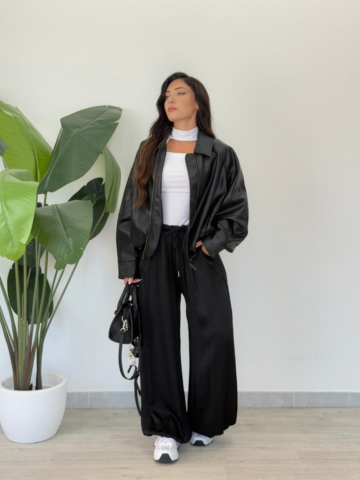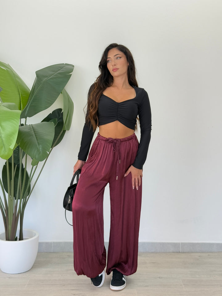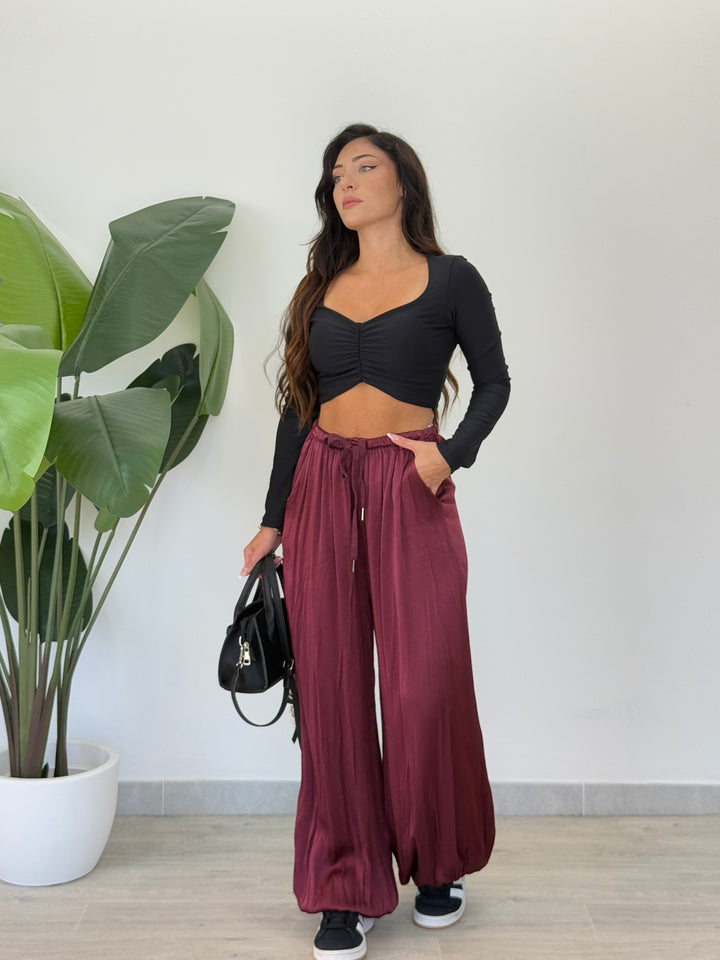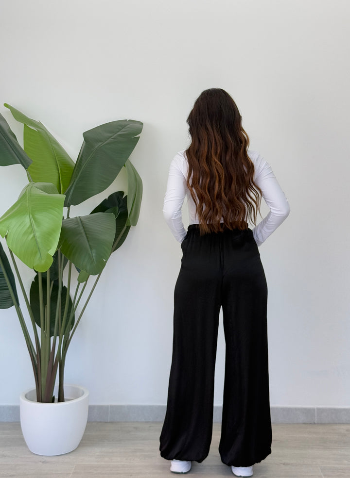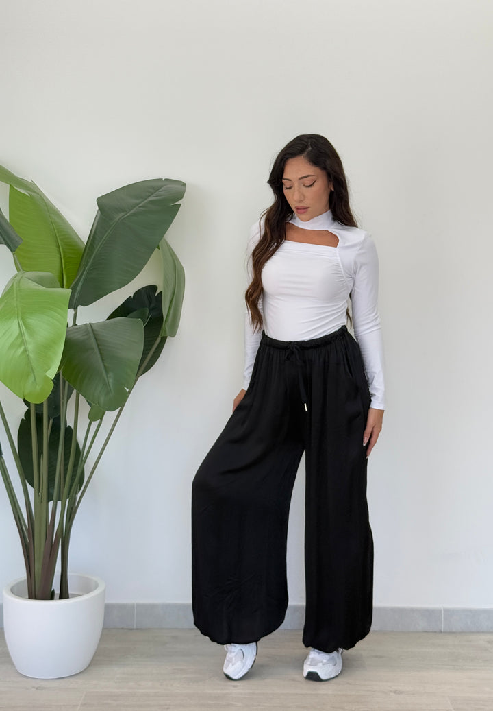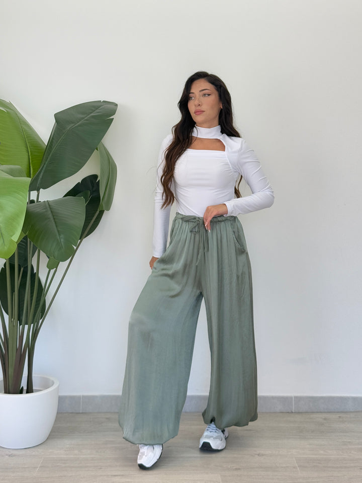 pantalone satinato gamba larga con coulisse ed elastico in vita ed elastico alla caviglie. Perfetto per qualsiasi outfit, pratico,comodo e versatile. Vestibilitá elasticizzata