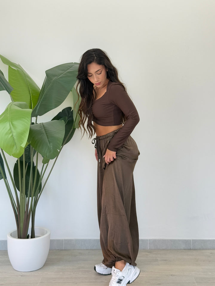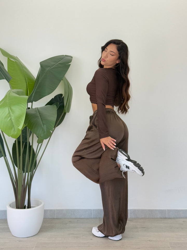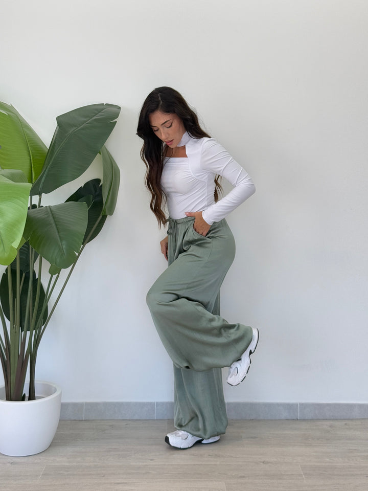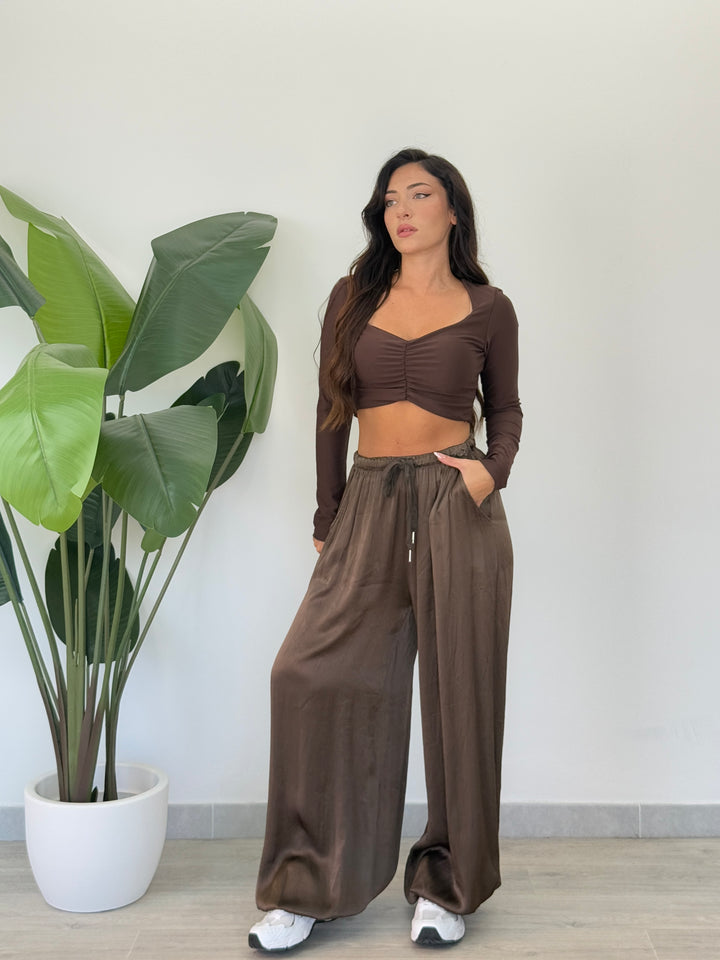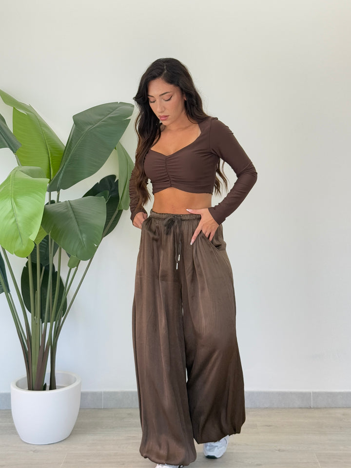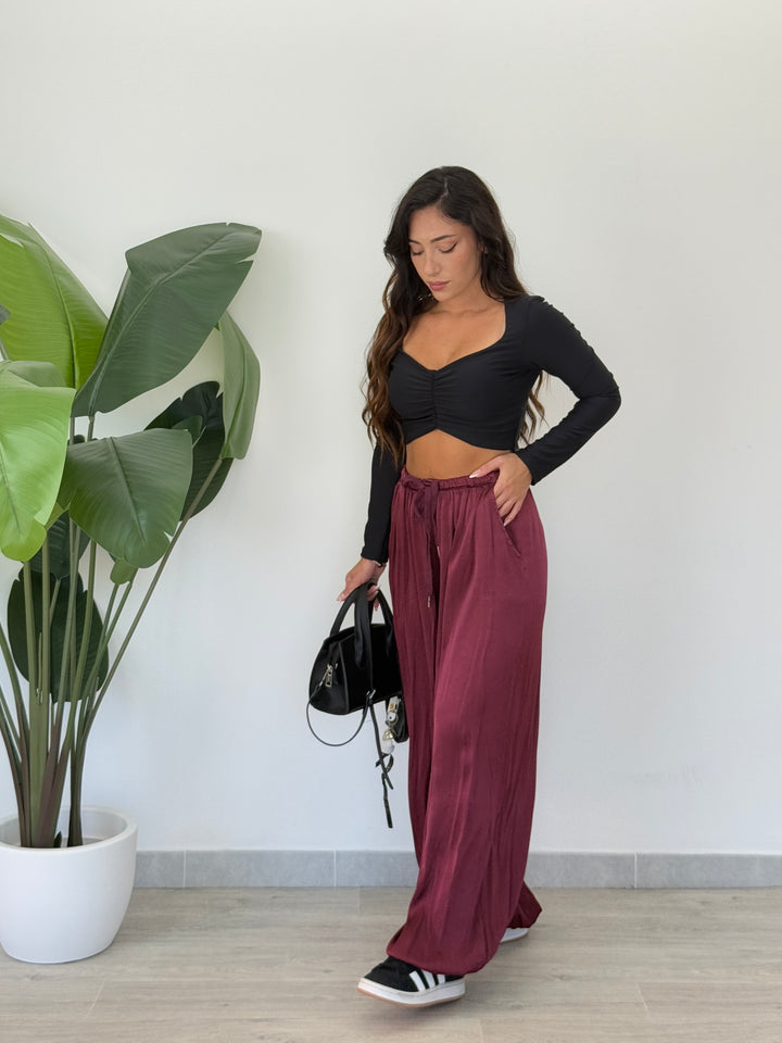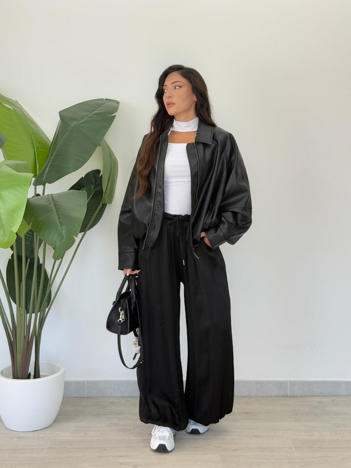 pantalone satinato gamba larga con coulisse ed elastico in vita ed elastico alla caviglie. Perfetto per qualsiasi outfit, pratico,comodo e versatile. Vestibilitá elasticizzata