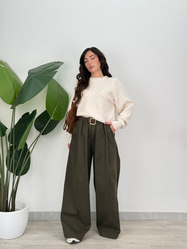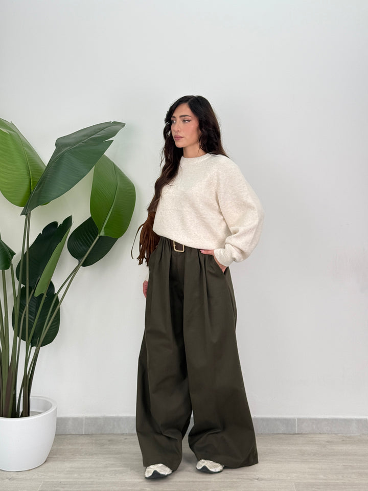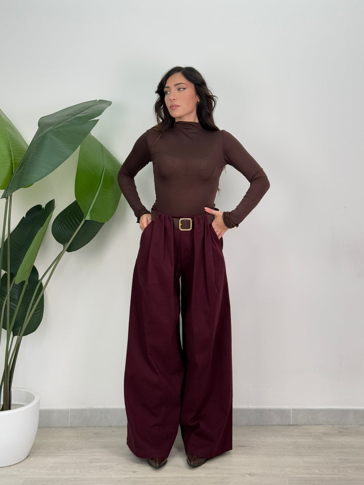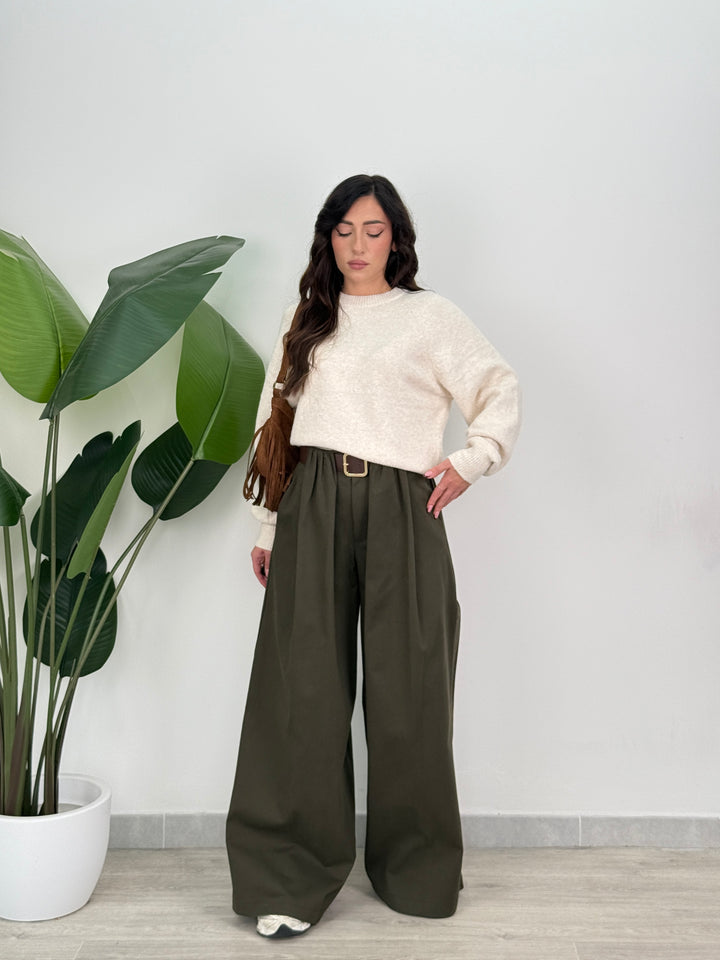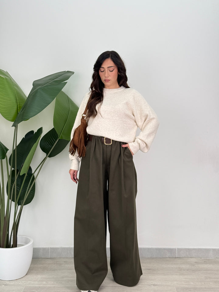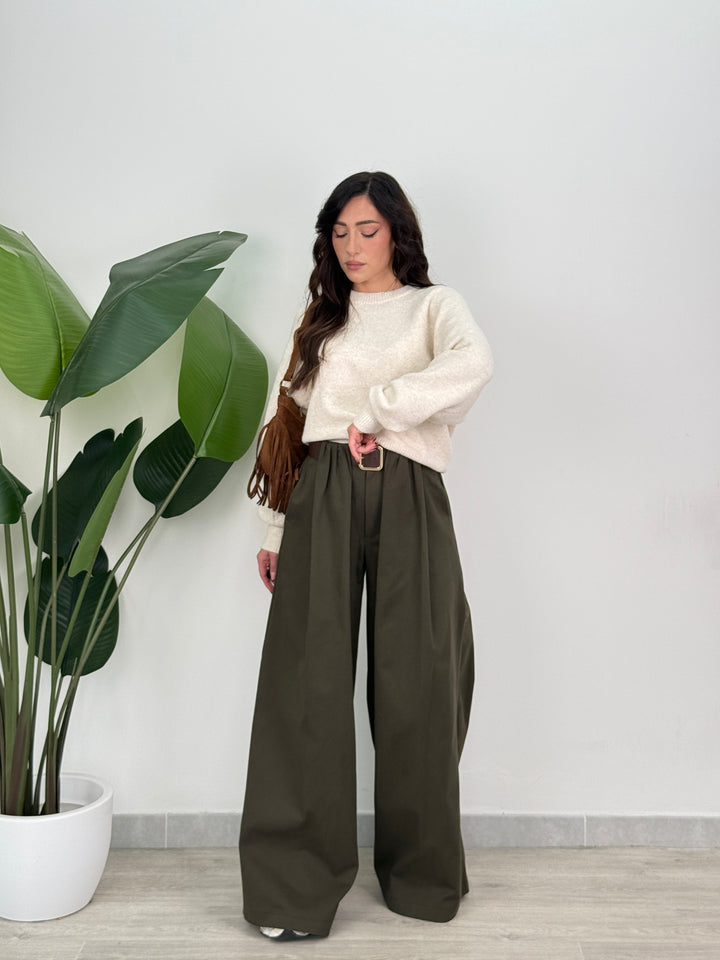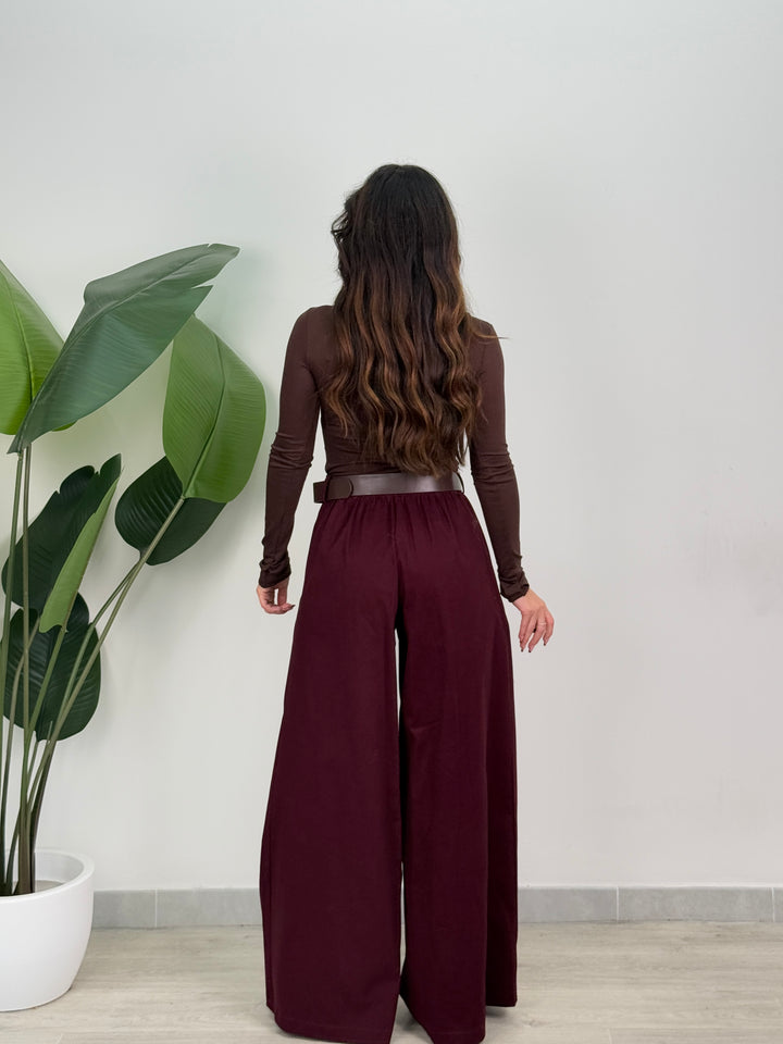 Scopri pantalone Scarlett! Pantalone palazzo ampio con elastico in vita sul retro , presenta una chiusura con bottone e zip centrale. Con cintura in vita regolabile e removibile. Perfetto per qualsiasi tipo di outfit.