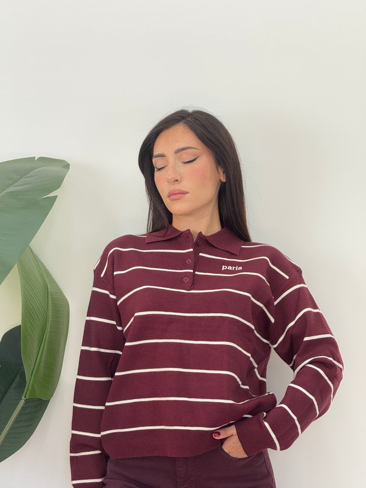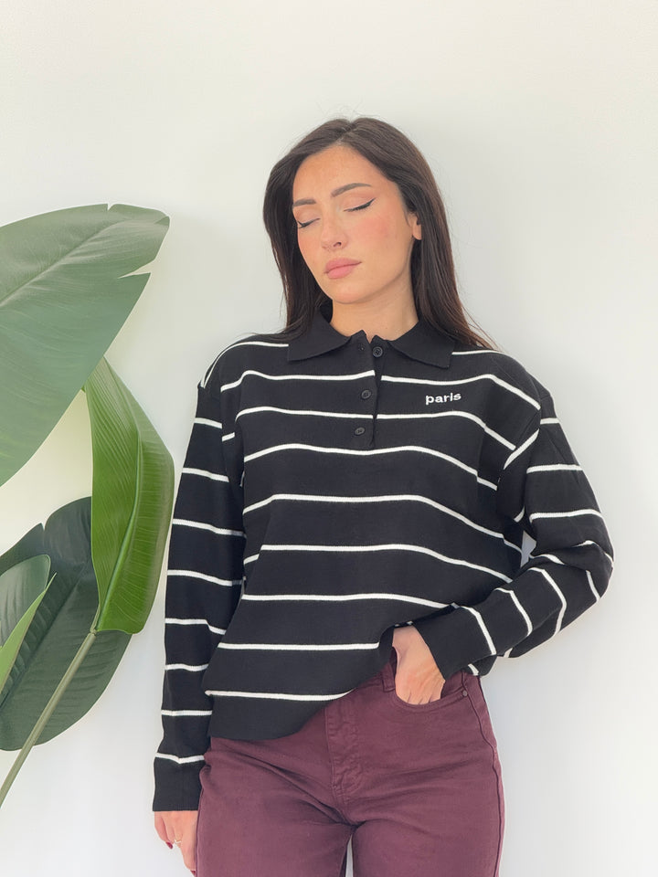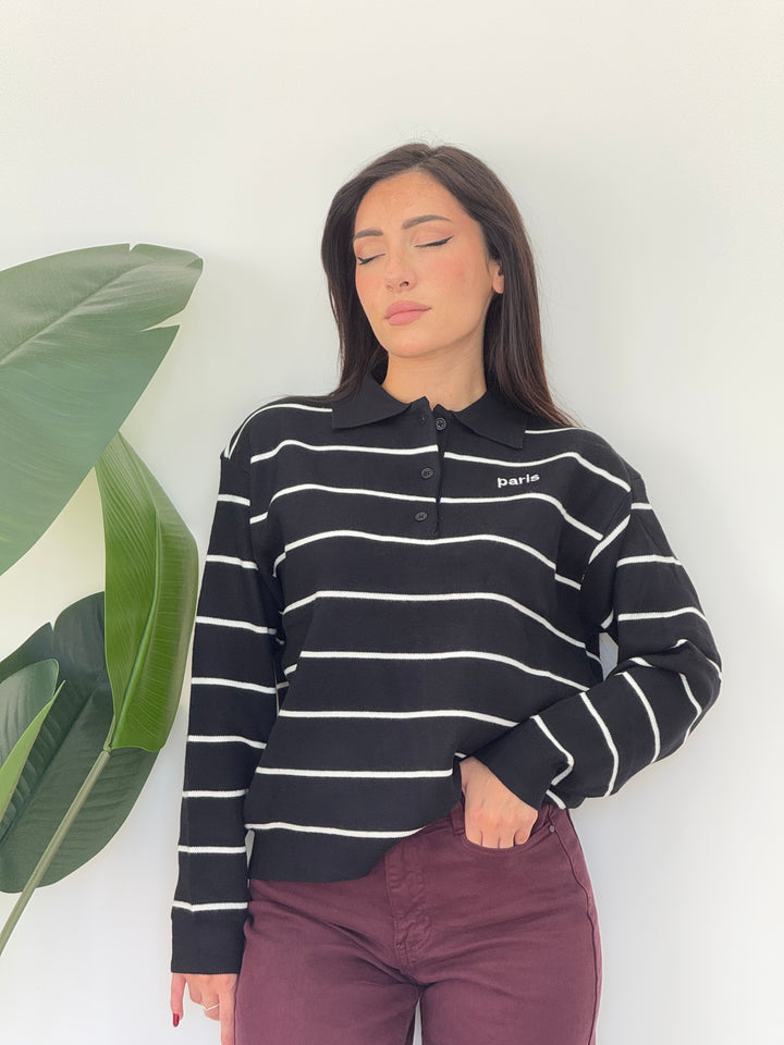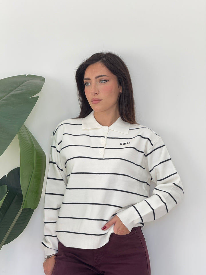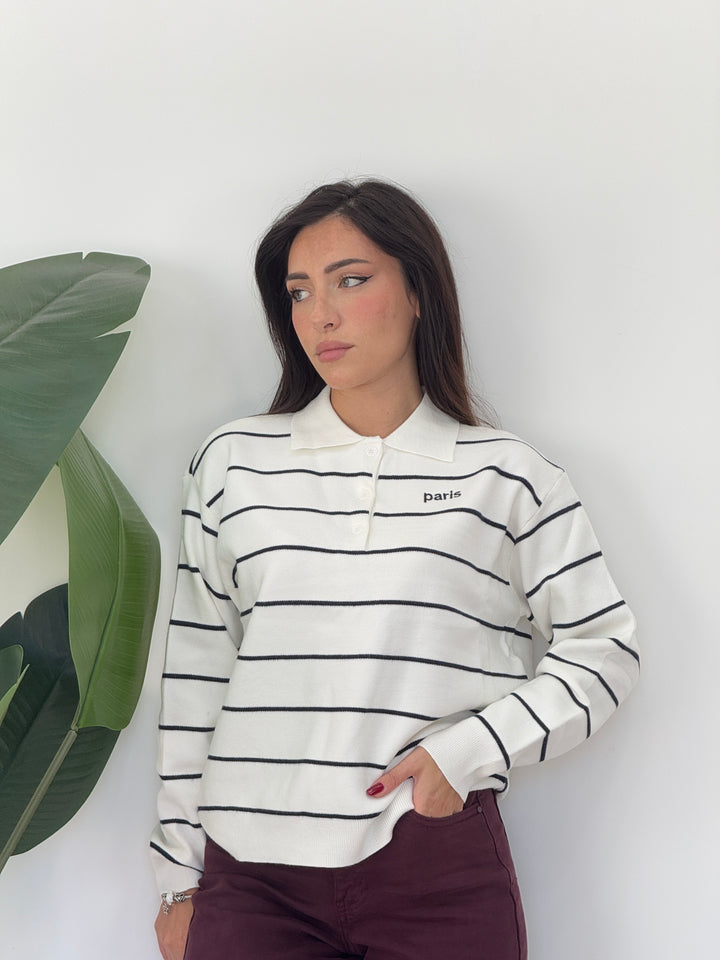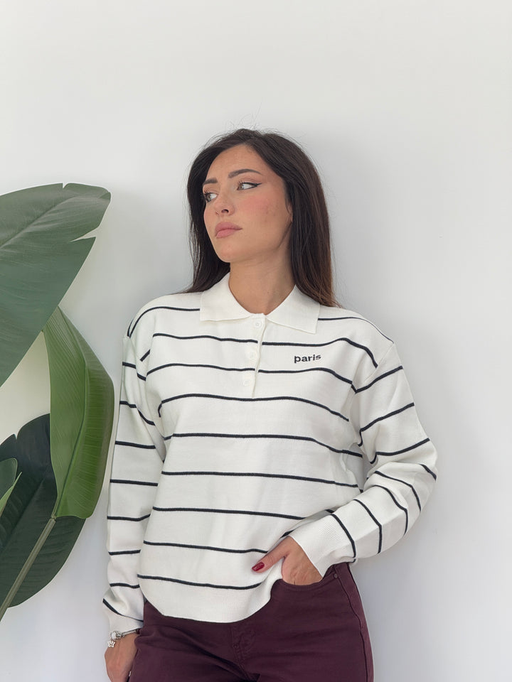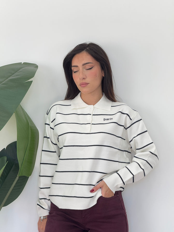 Polo Paris realizzato in lana rasata. Modello pullover che presenta un colletto classico e tre bottoni , stampa a righe . Perfetto per qualsiasi occasione .Vestibilità elasticizzata