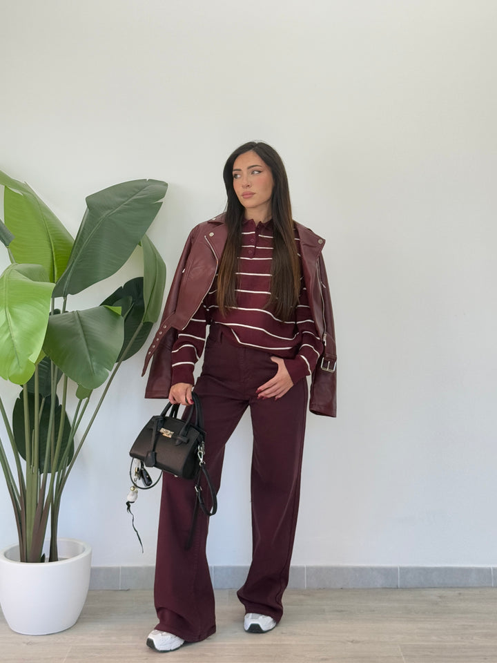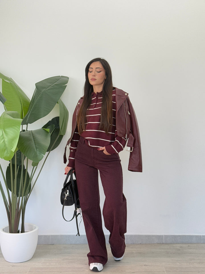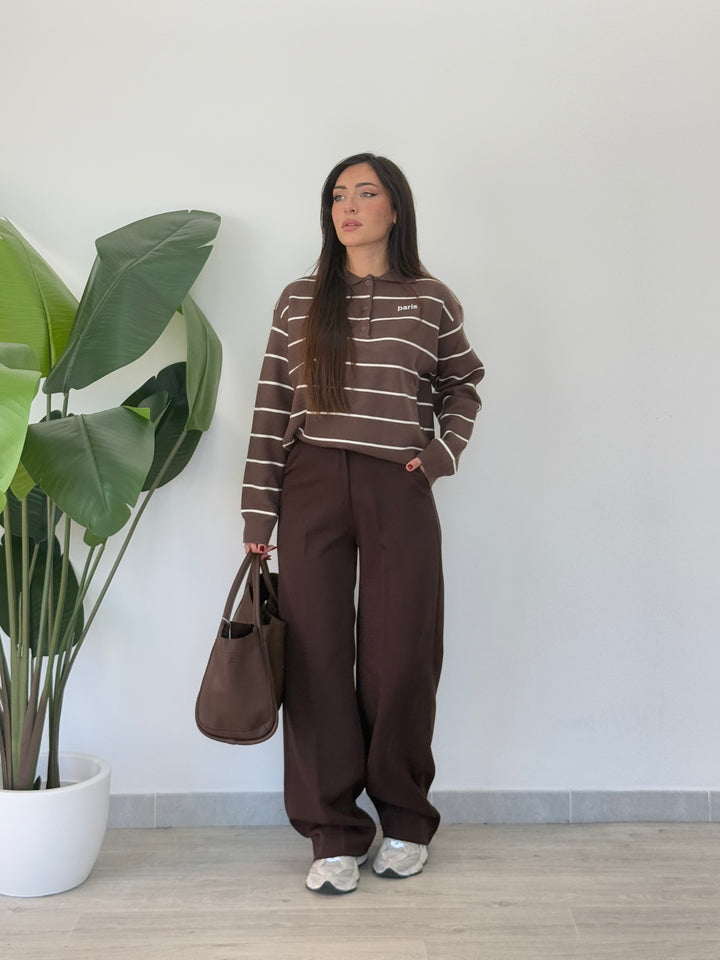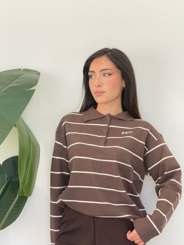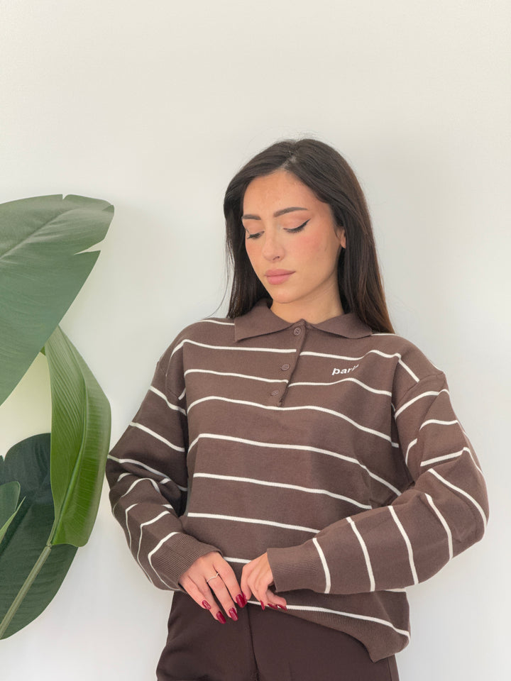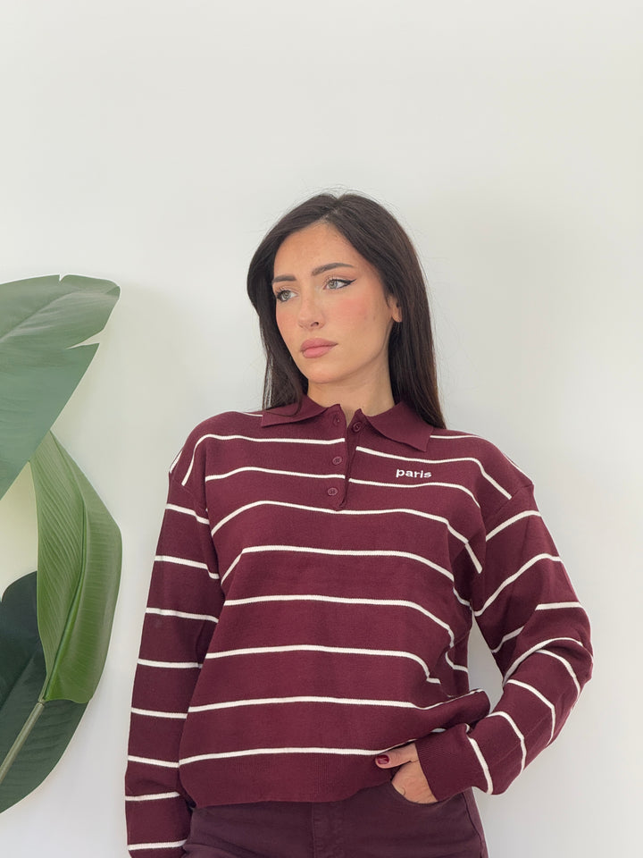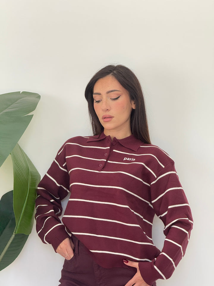 Polo Paris realizzato in lana rasata. Modello pullover che presenta un colletto classico e tre bottoni , stampa a righe . Perfetto per qualsiasi occasione .Vestibilità elasticizzata