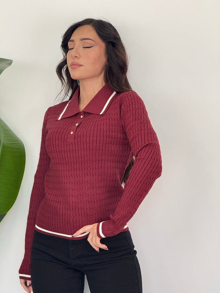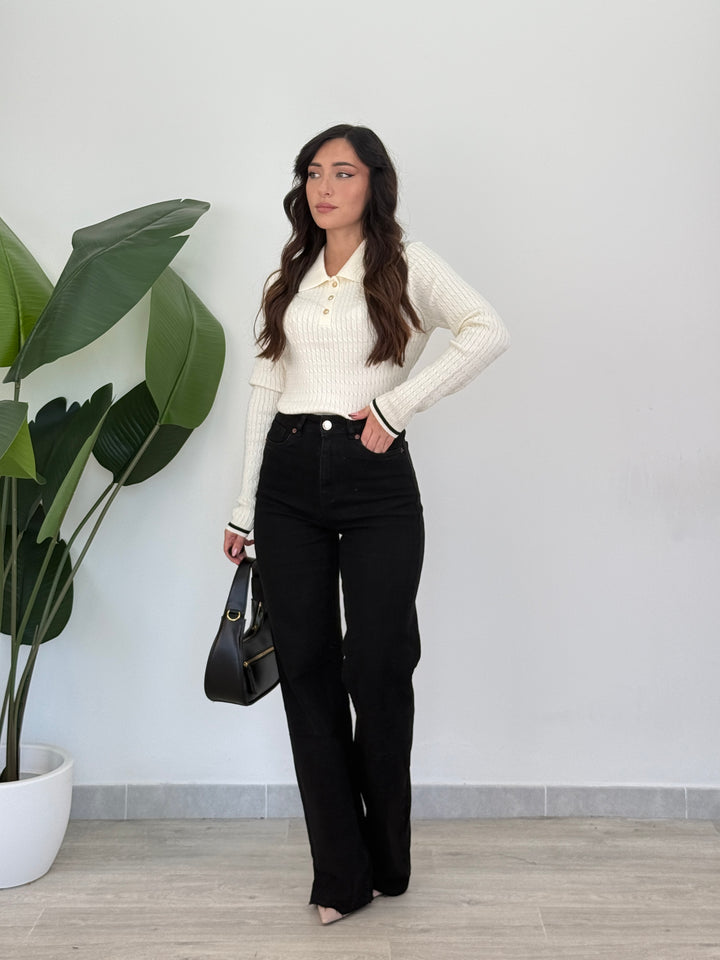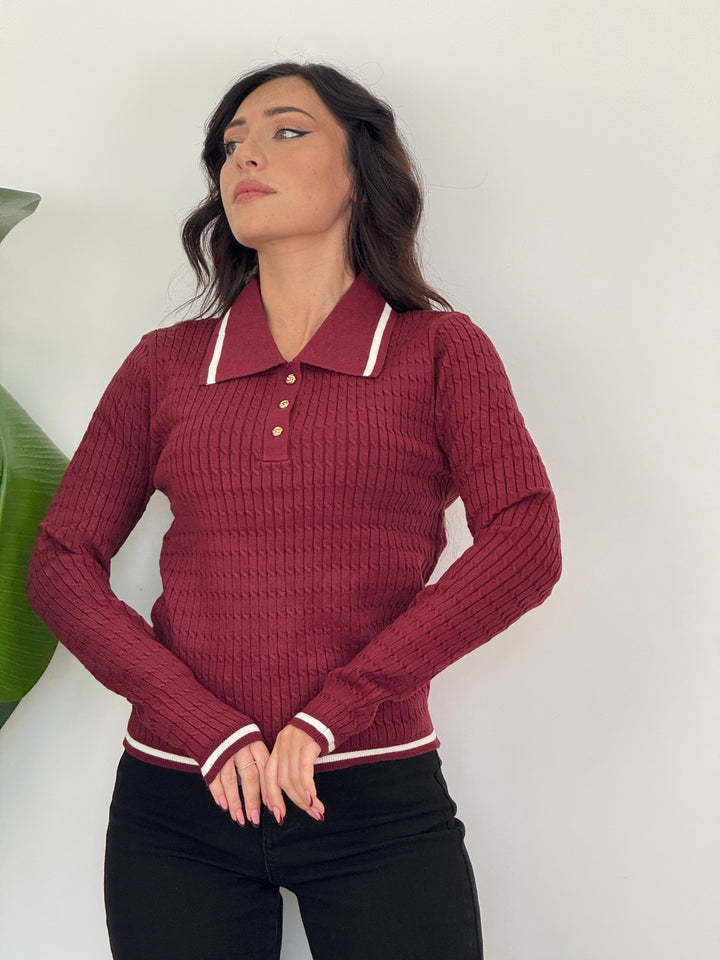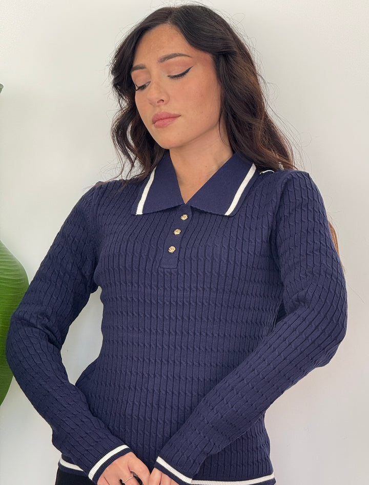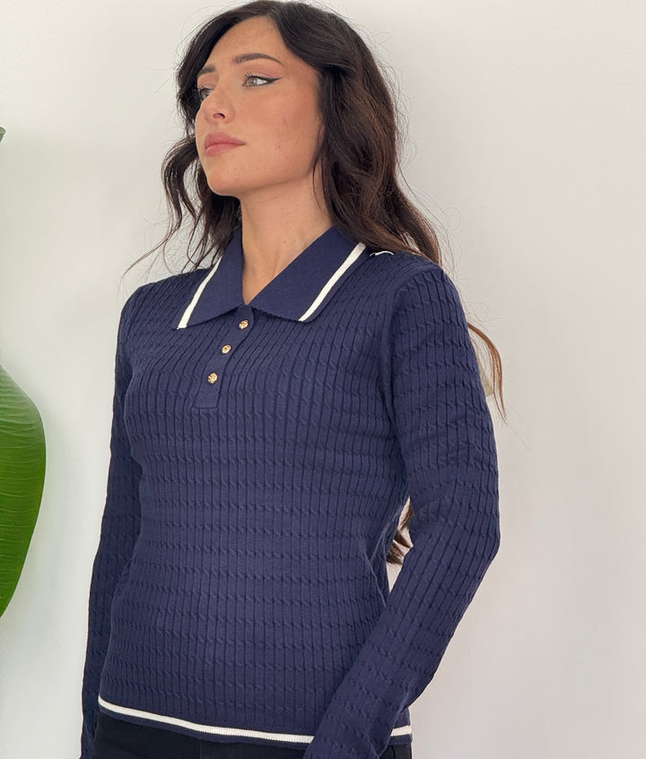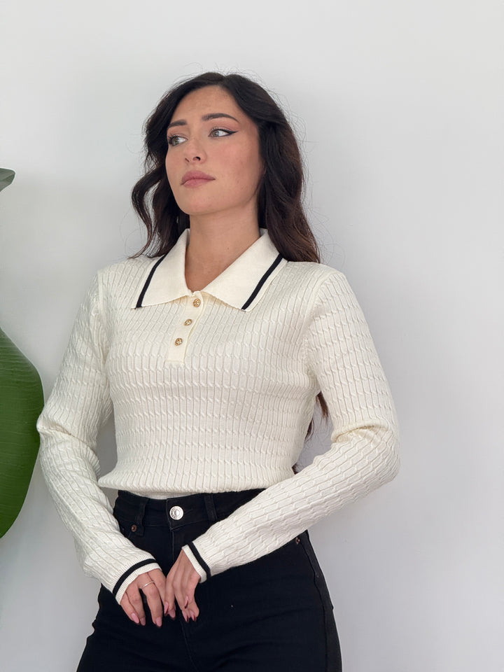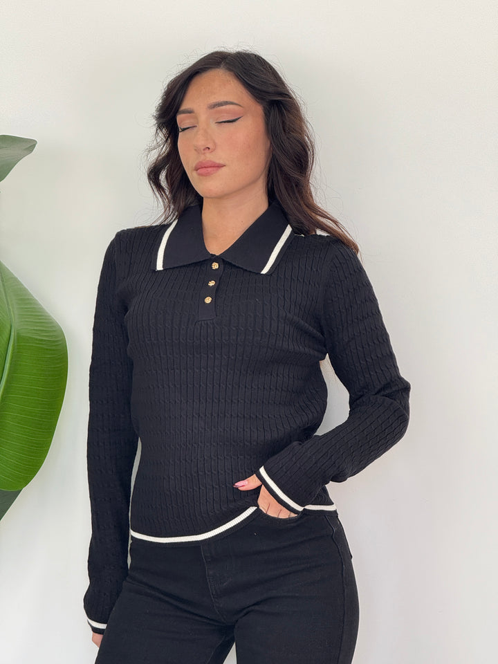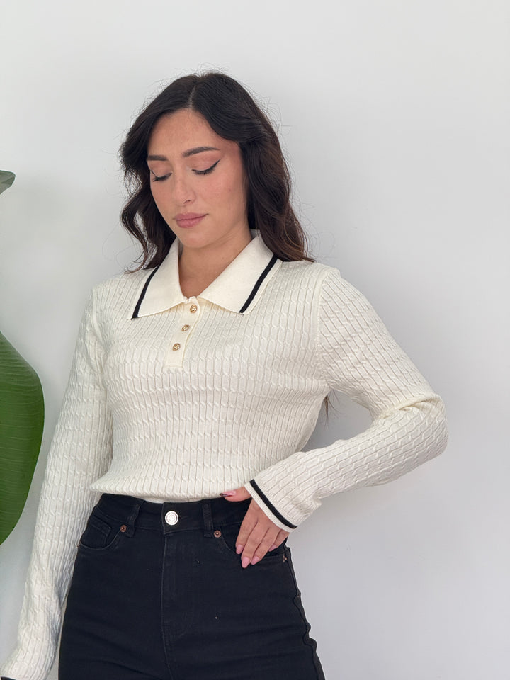 Scopri la polo Raffy! Poko rifinita da bordino, tre bottoni dorati e maniche lunghe . Realizzata in tessuto morbido ed elastico, ideale per look casual chic.