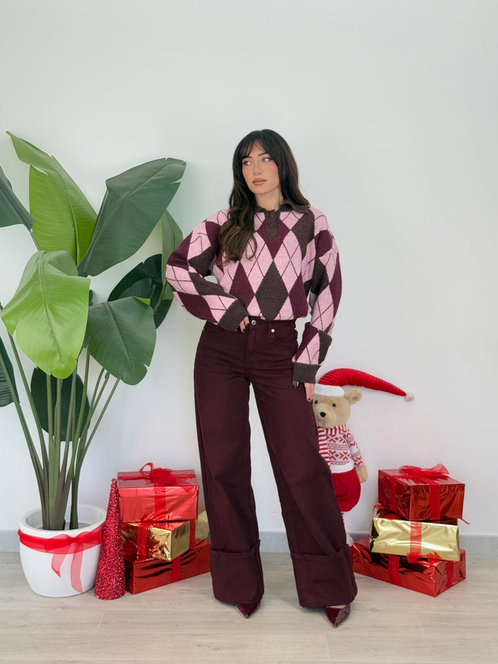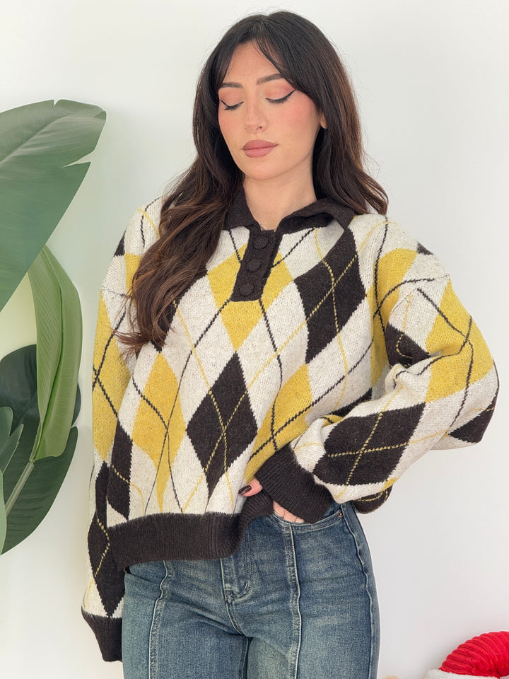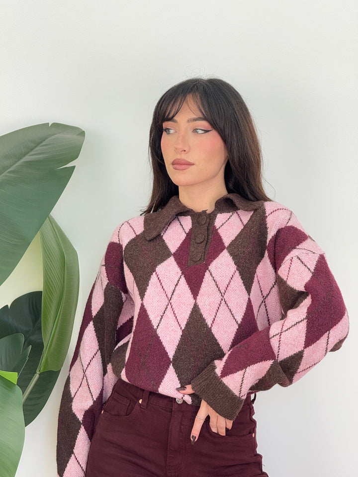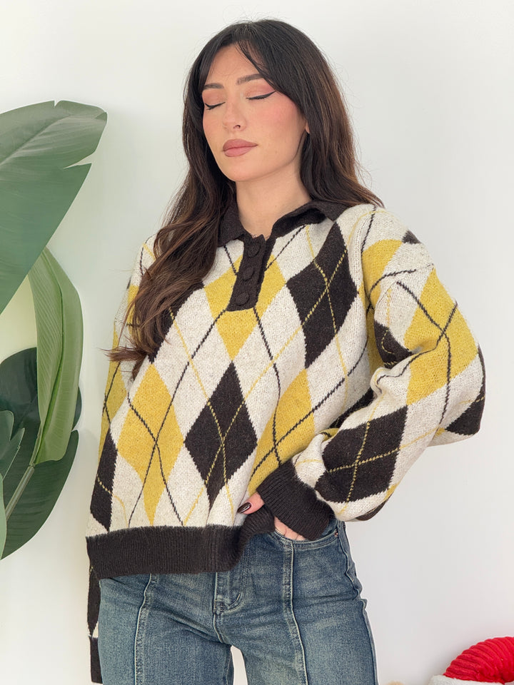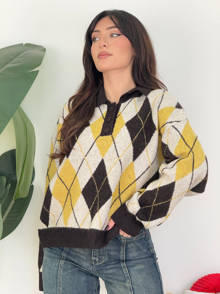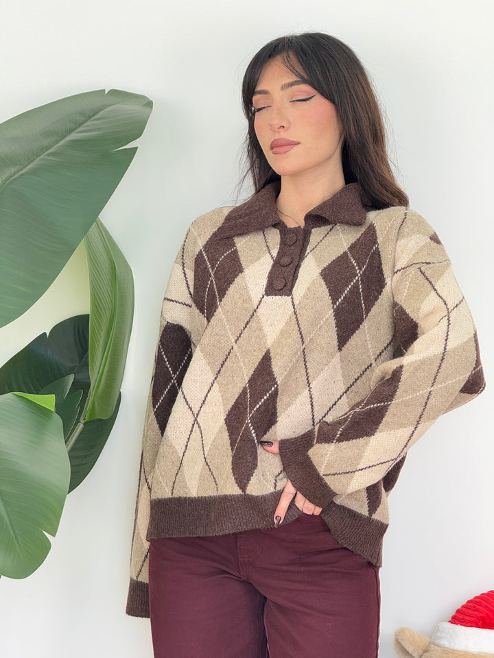 Polo rombi iene . Realizzata in lana morbida con motivo a rombi. Presenta colletto classico con tre bottoni tono su tono e maniche lunghe, perfetta per un look casual e raffinato nelle giornate invernali super calda . Vestibilità semi over