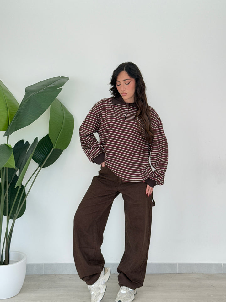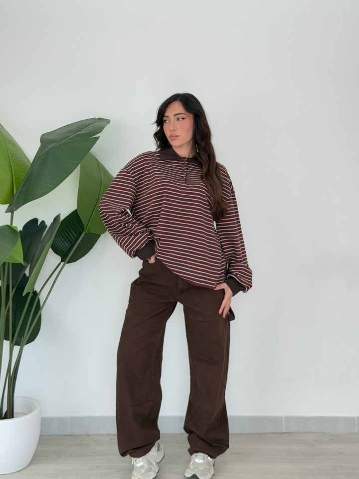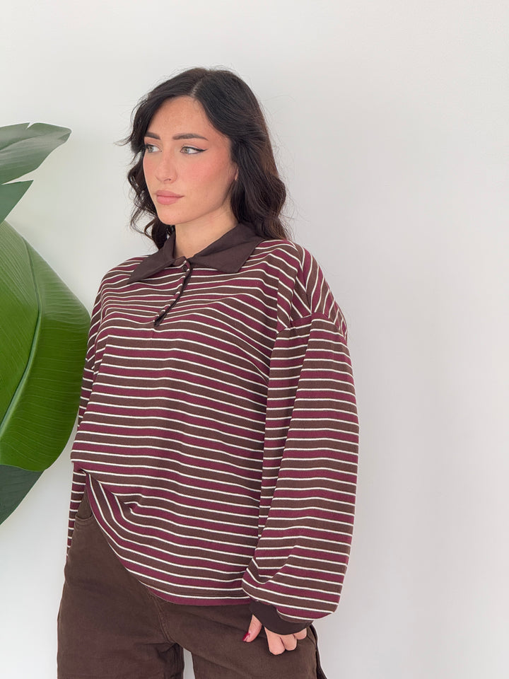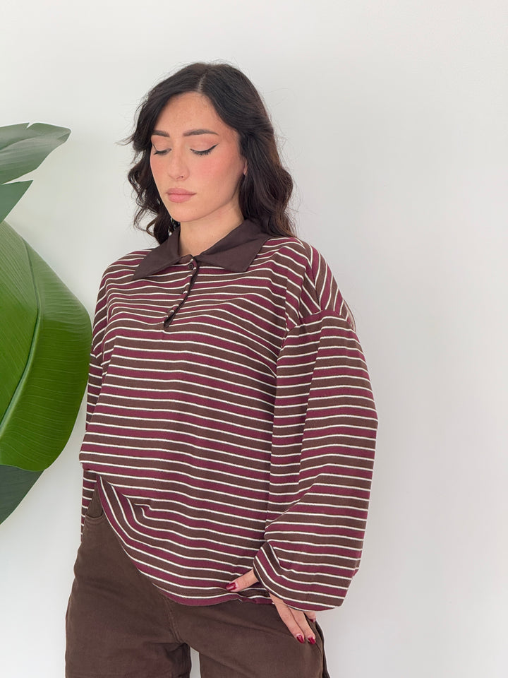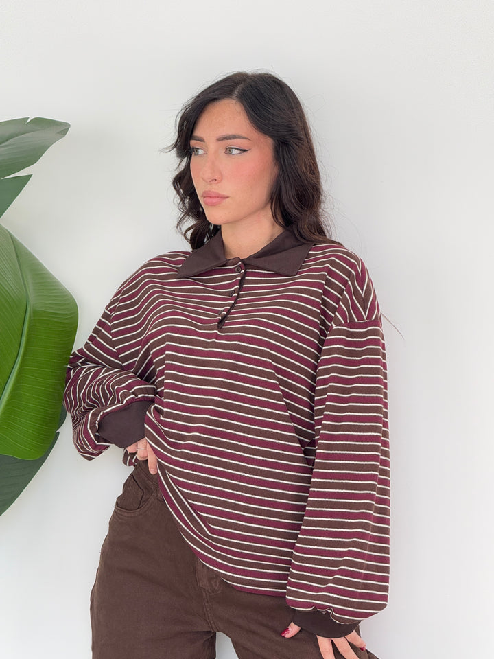 Polo oversize a maniche lunghe con righe orizzontali, colletto e chiusura a tre bottoni. Ha una vestibilità morbida per uno stile casual e rilassato.