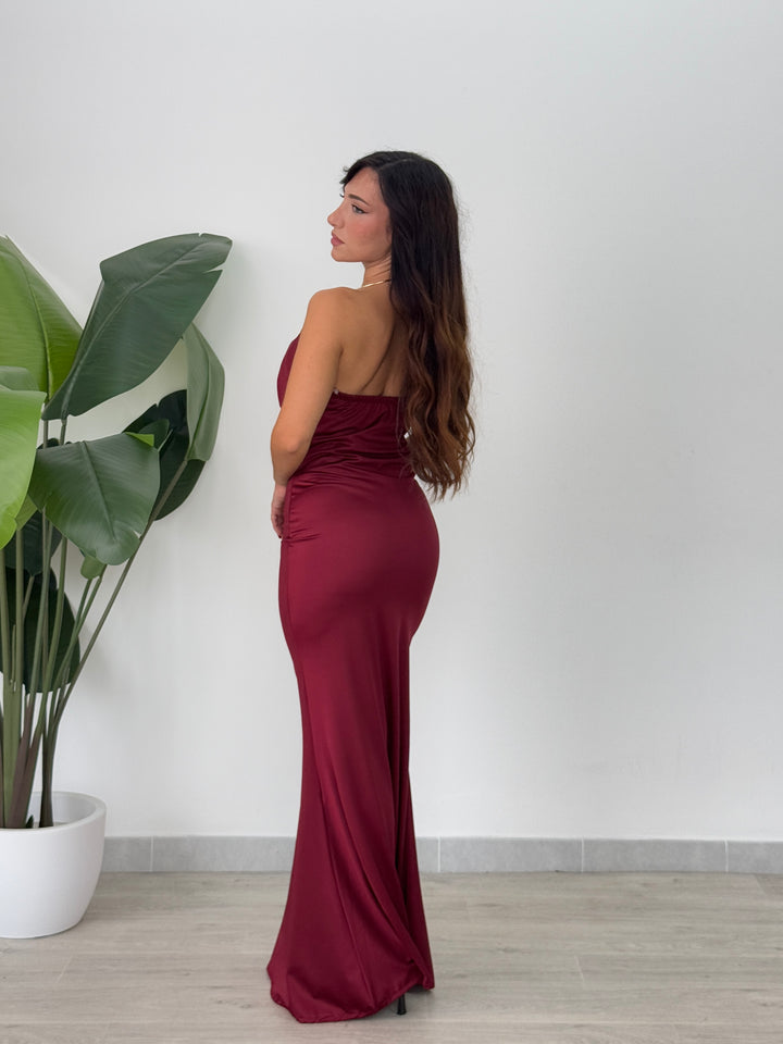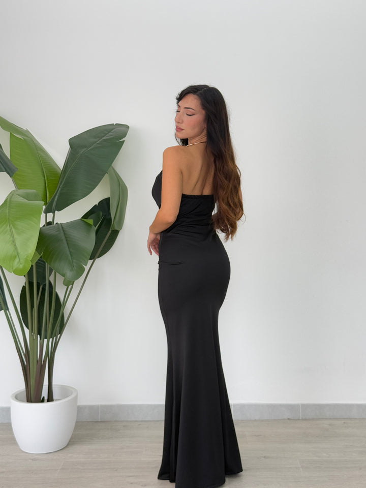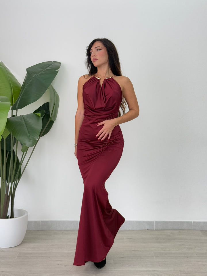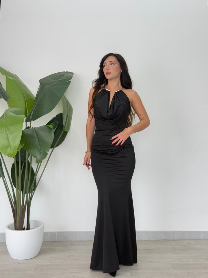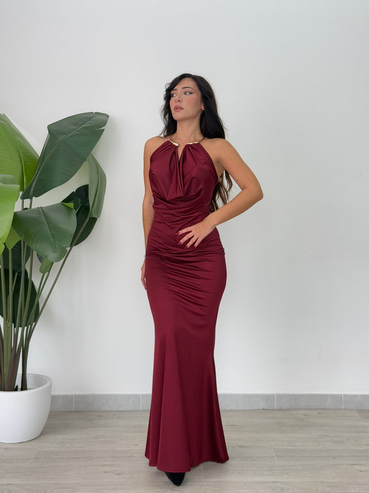 Scopri l’abito Hamely! Abito con scollo halter drappeggiato rifinito da una collana dorata integrata. La vestibilità aderente esalta la vita e si apre in una gonna a sirena che allunga e slancia la figura. Perfetto per le tue occasioni eleganti! Vestibilità elasticizzata