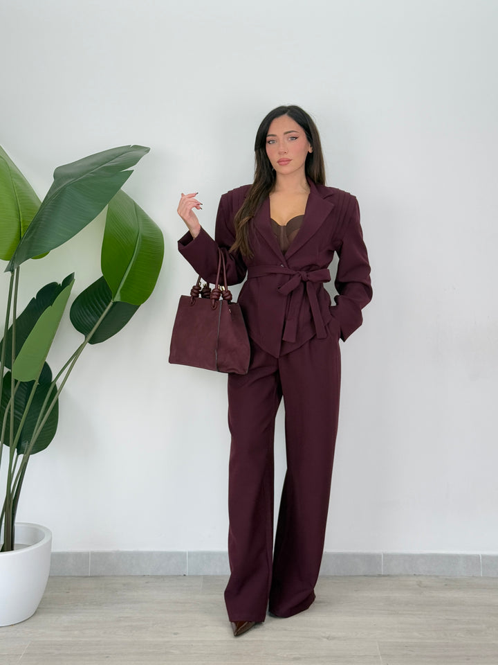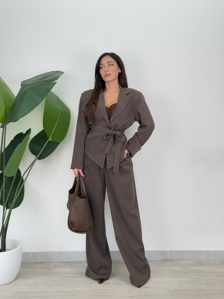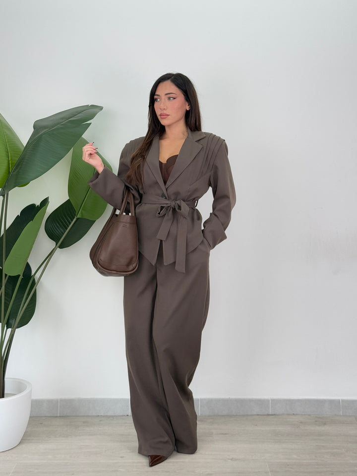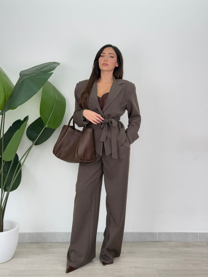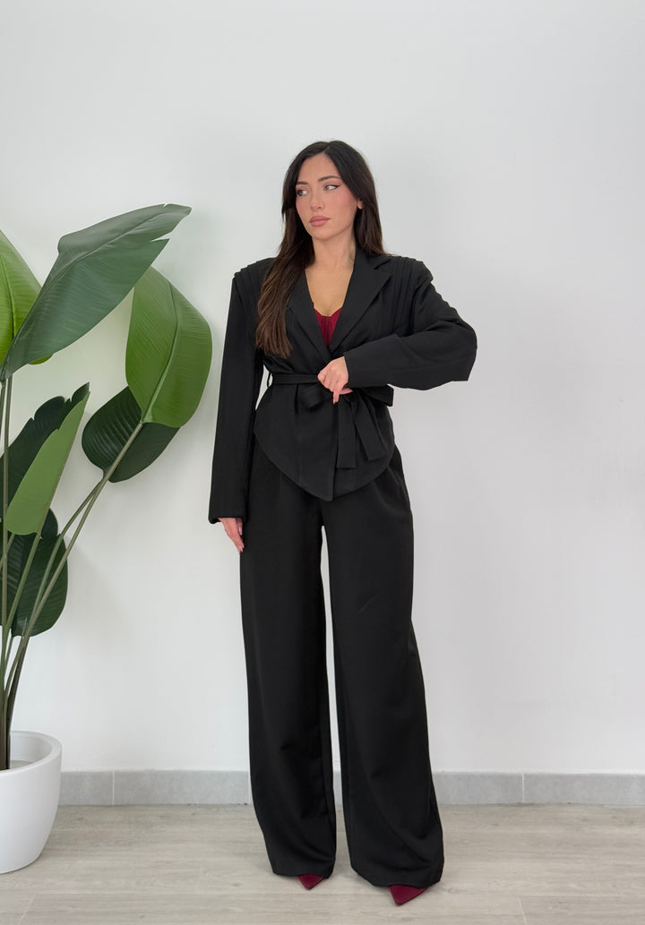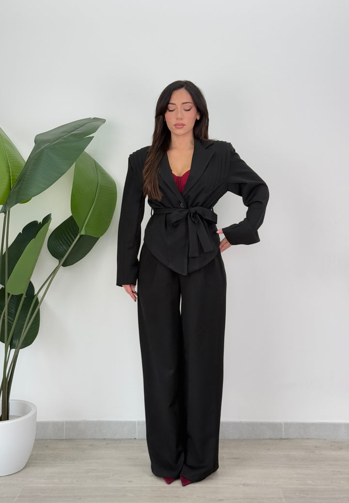 Tailleur Armonia è composto da blazer con spallina strutturata ampia ,foderato all’interno e chiusura monopetto, inoltre presenta una cintura in vita regolabile per valorizzare il punto vita.