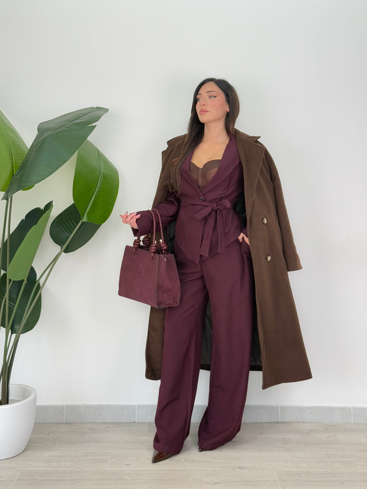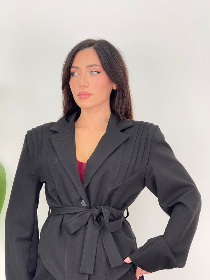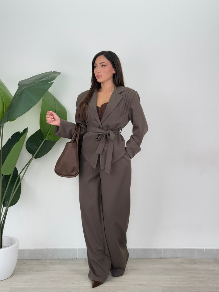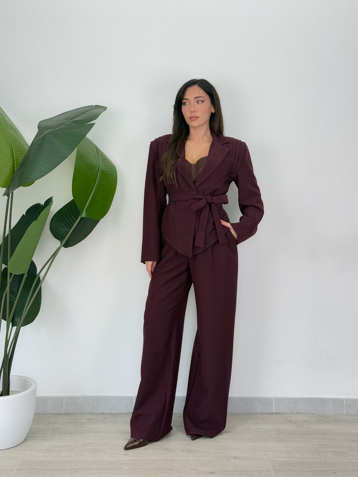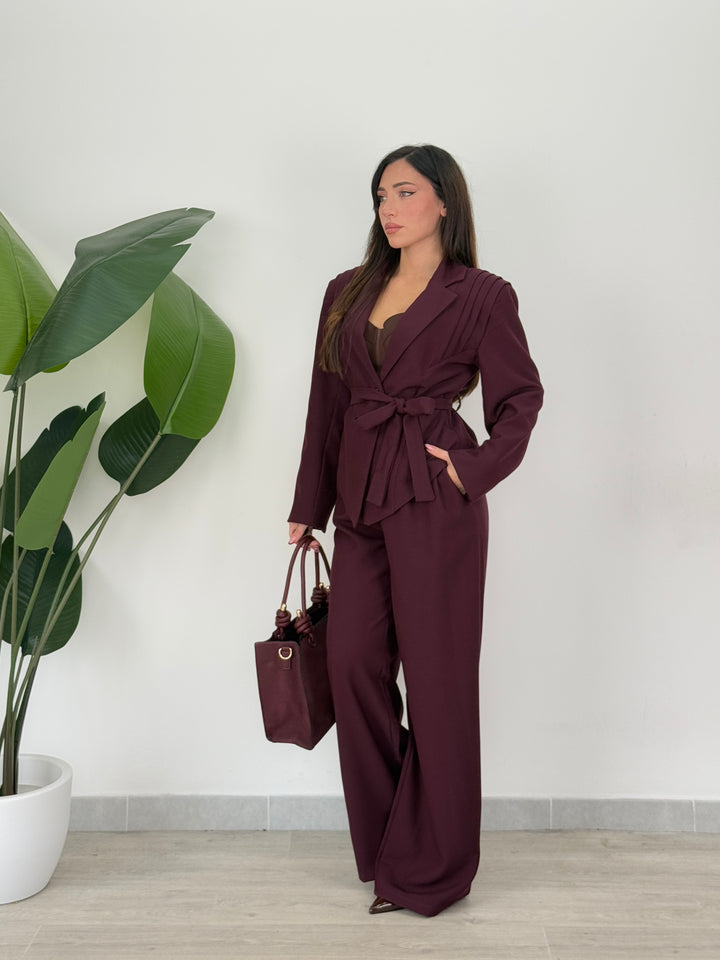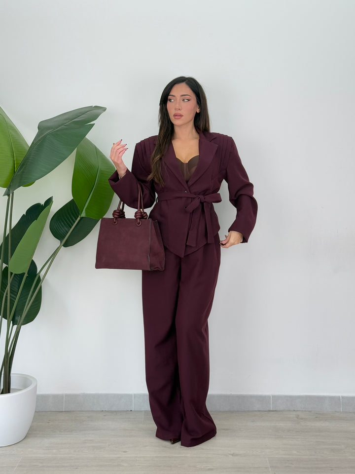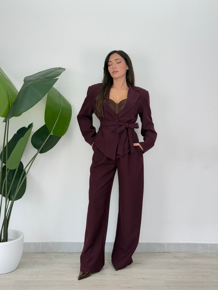 Tailleur Armonia è composto da blazer con spallina strutturata ampia ,foderato all’interno e chiusura monopetto, inoltre presenta una cintura in vita regolabile per valorizzare il punto vita.