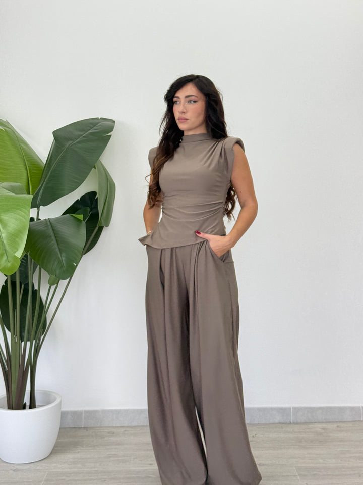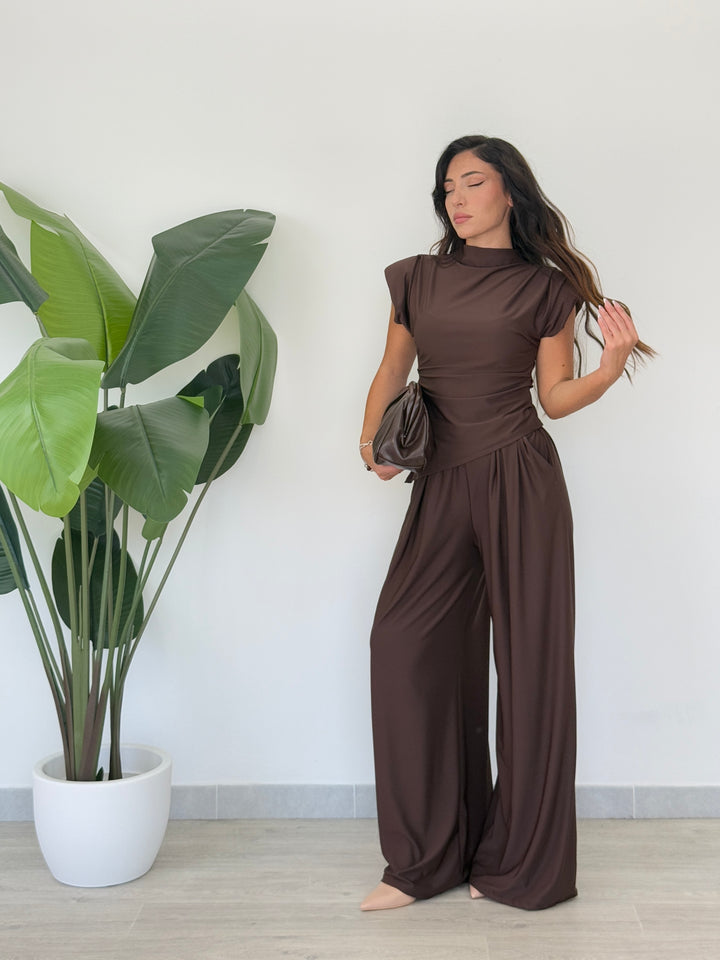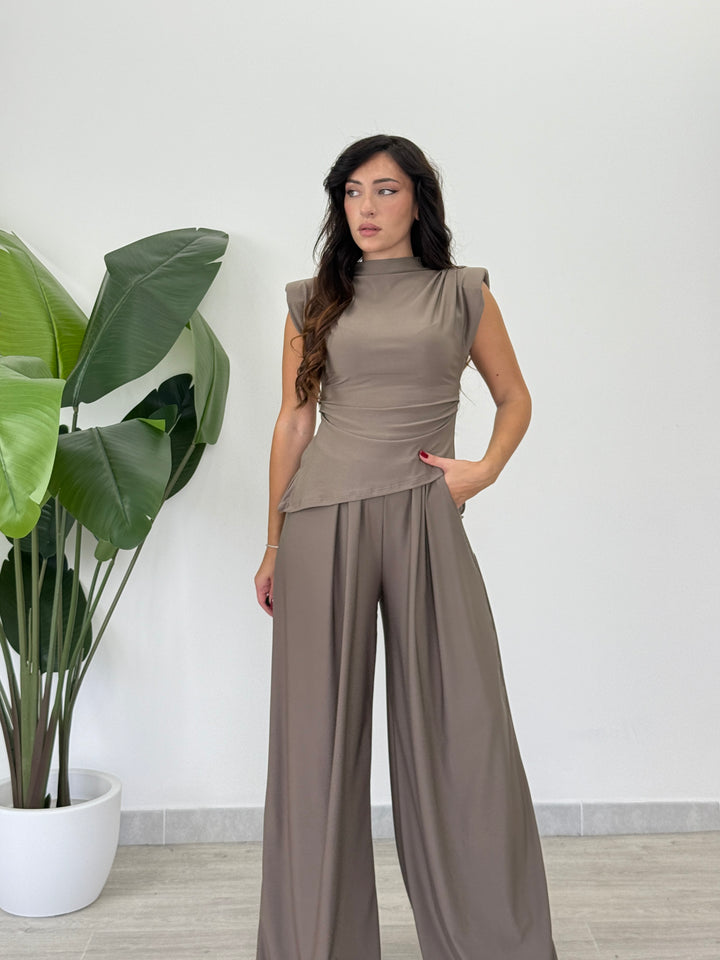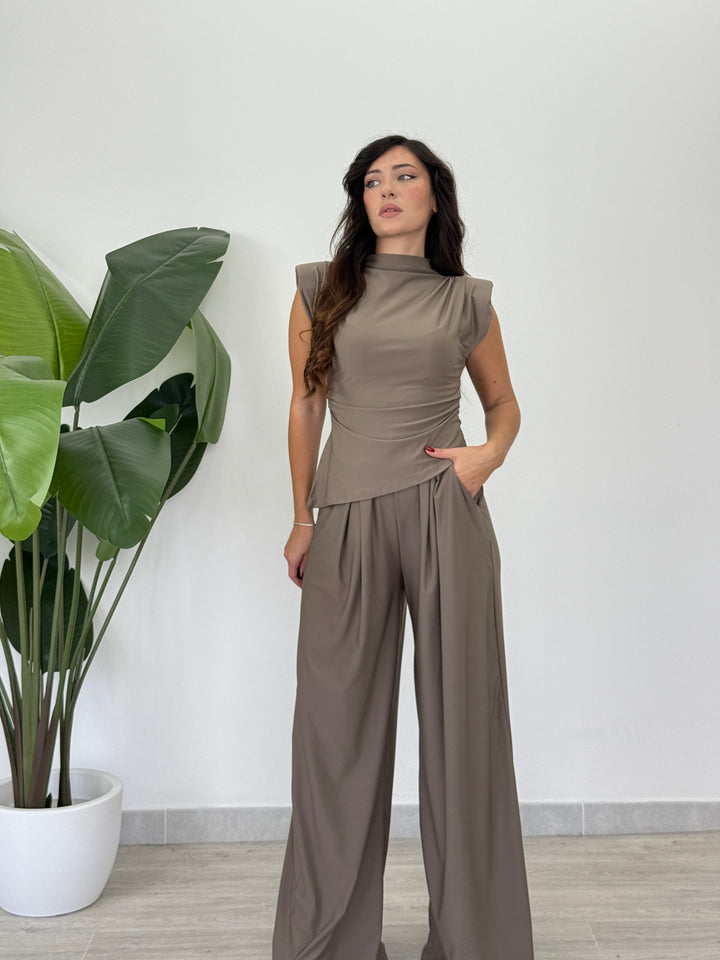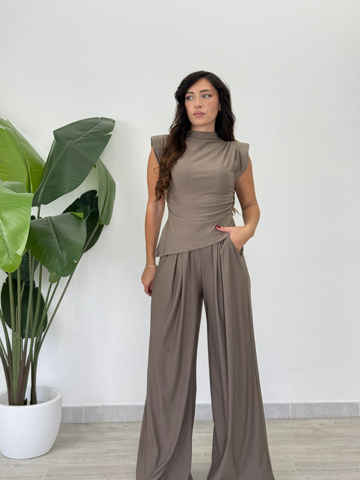 Coordinato Monia , perfetto per ogni tua occasione. Consigliato per l’eleganza ma anche per la comodità; composto da maglia giromanica e taglio asimmetrico, pantalone con elastico in vita , taglio gamba larga .