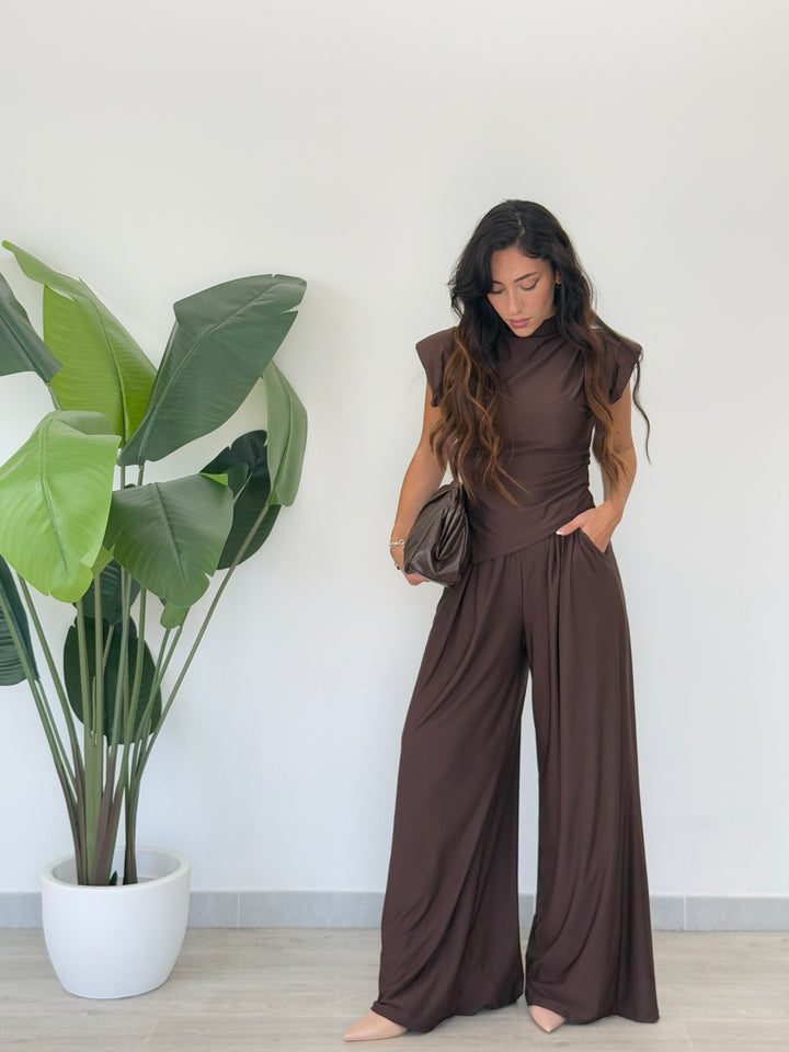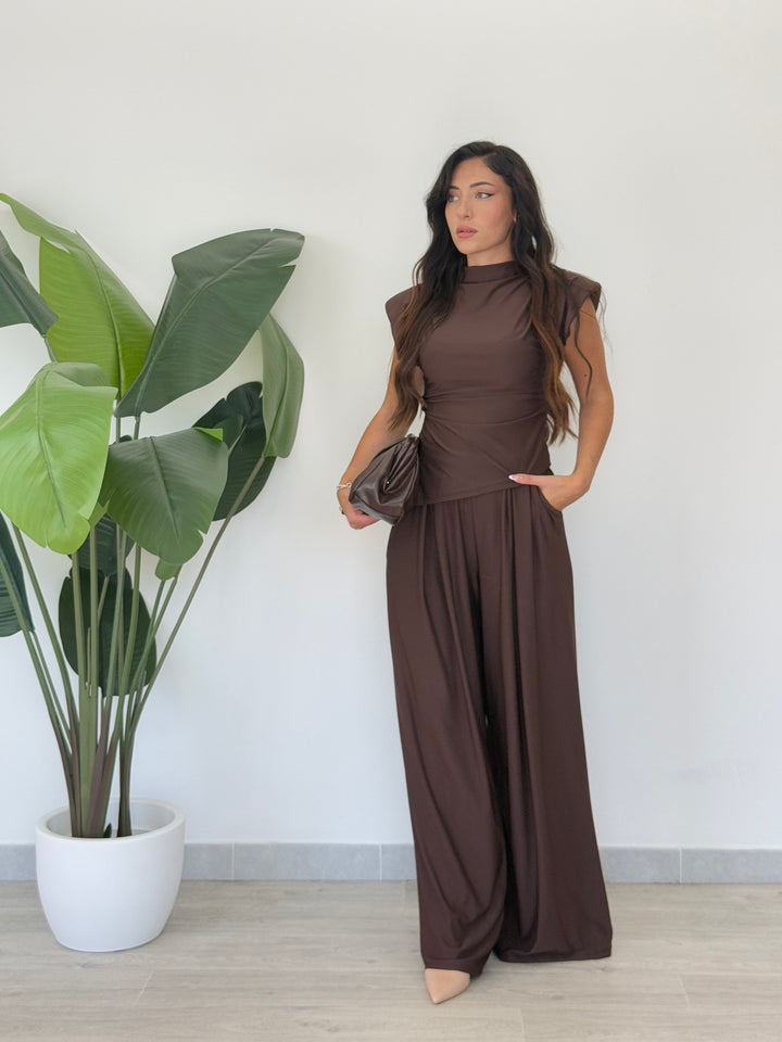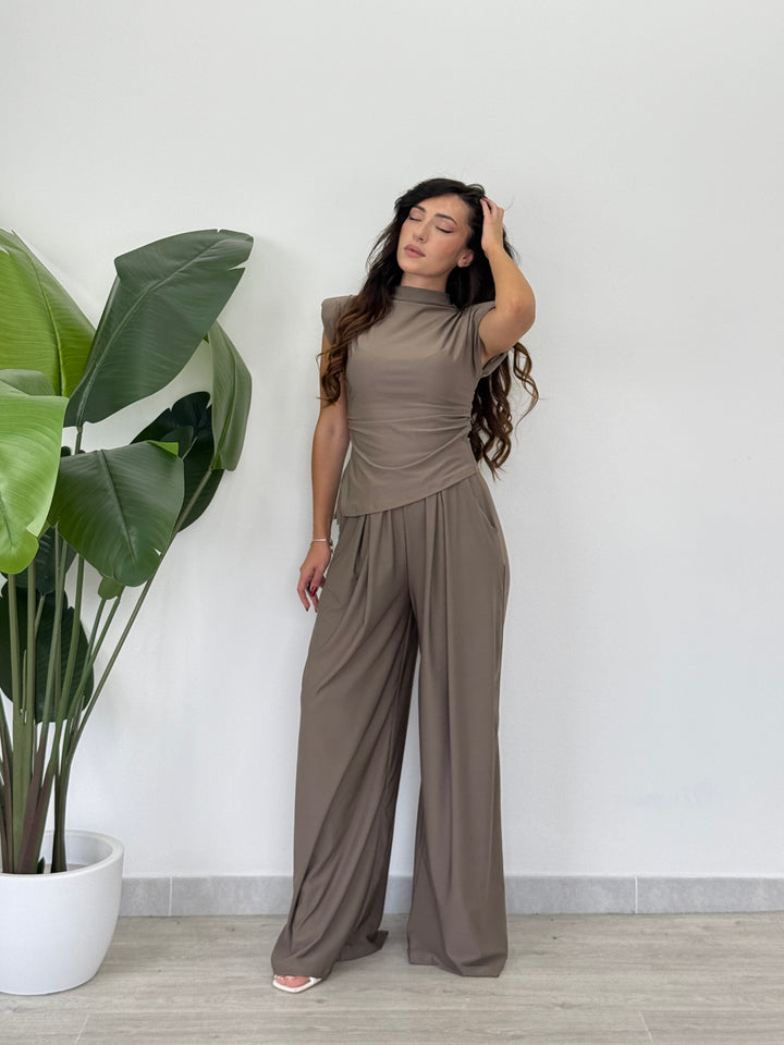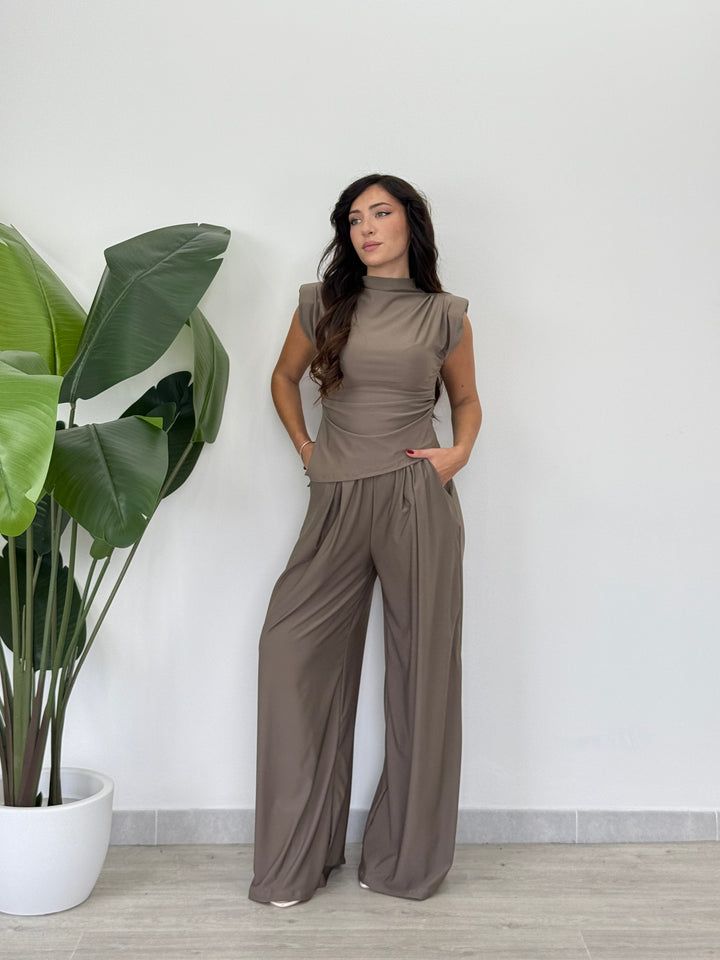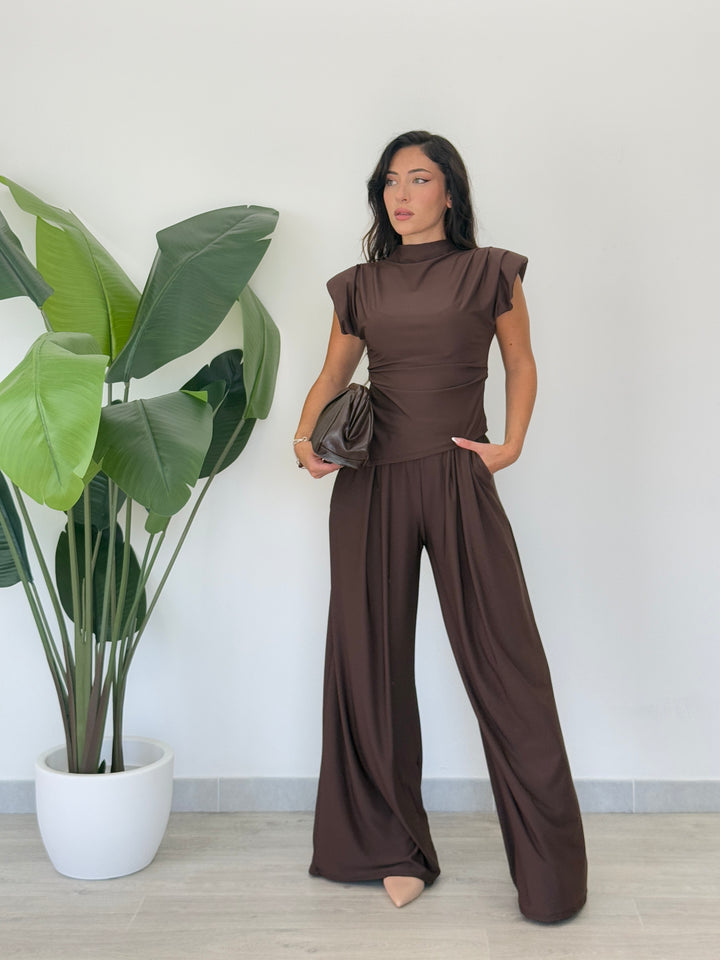 Coordinato Monia , perfetto per ogni tua occasione. Consigliato per l’eleganza ma anche per la comodità; composto da maglia giromanica e taglio asimmetrico, pantalone con elastico in vita , taglio gamba larga .