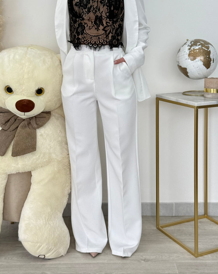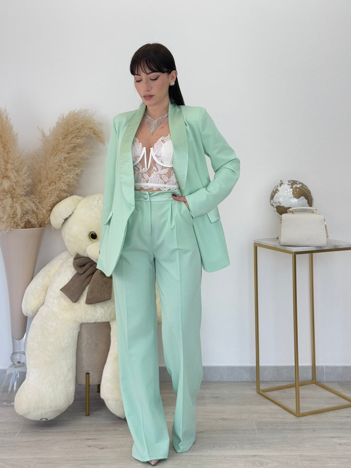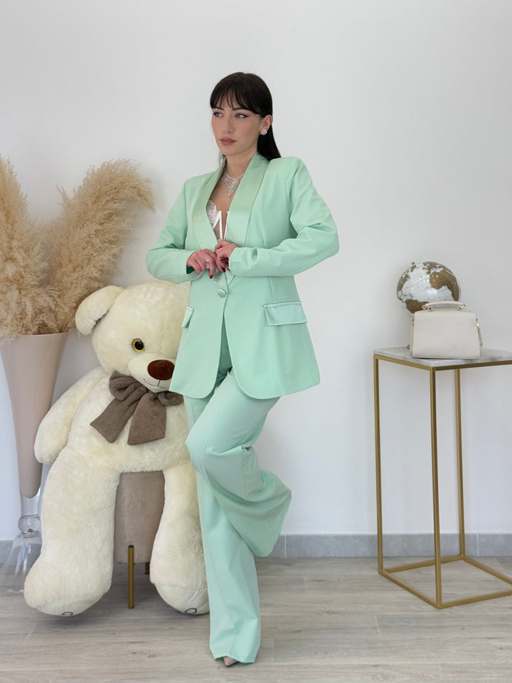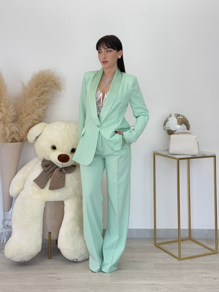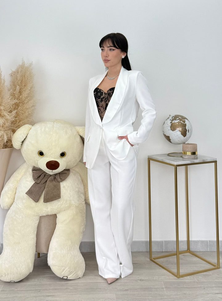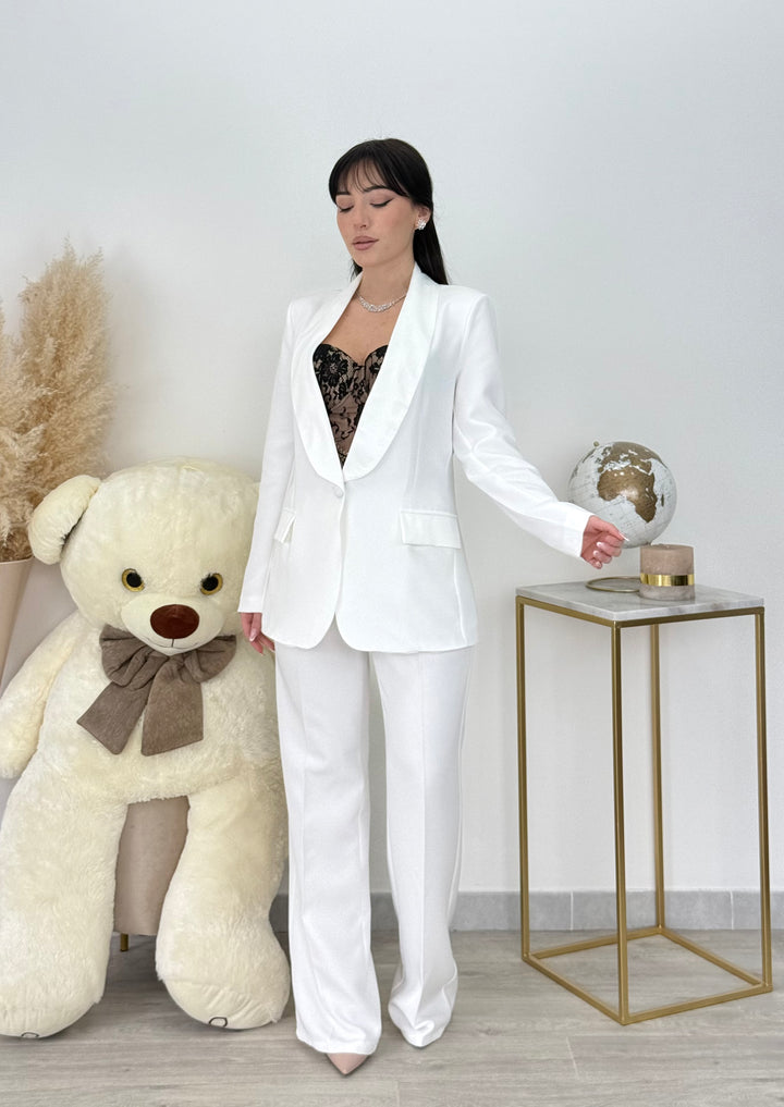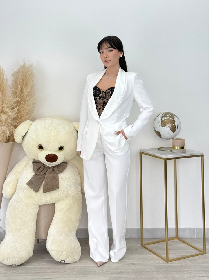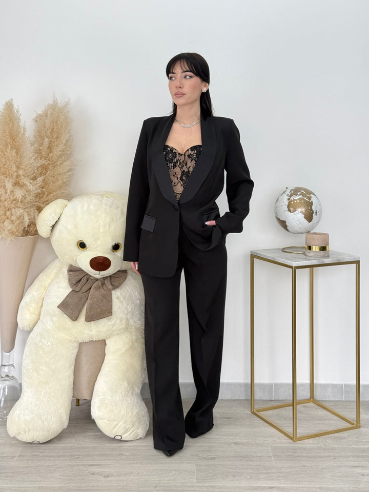 Tailleur Carla con giacca monopetto con dettaglio rever in raso . Pantaloni vita alta modello gamba dritta con bottone zip .È un tailleur perfetto per le tue occasioni speciali! Vestibilitá regular
