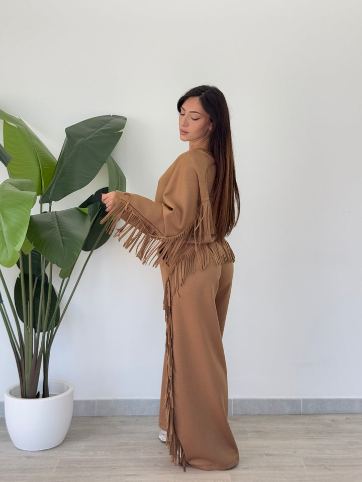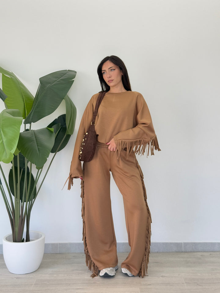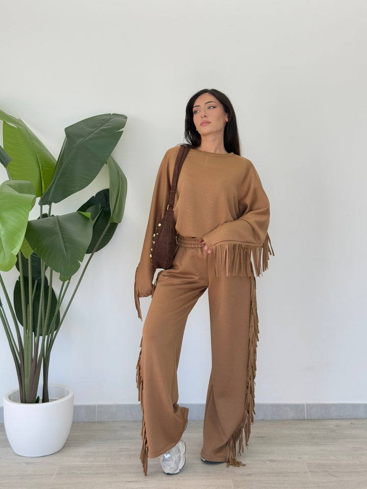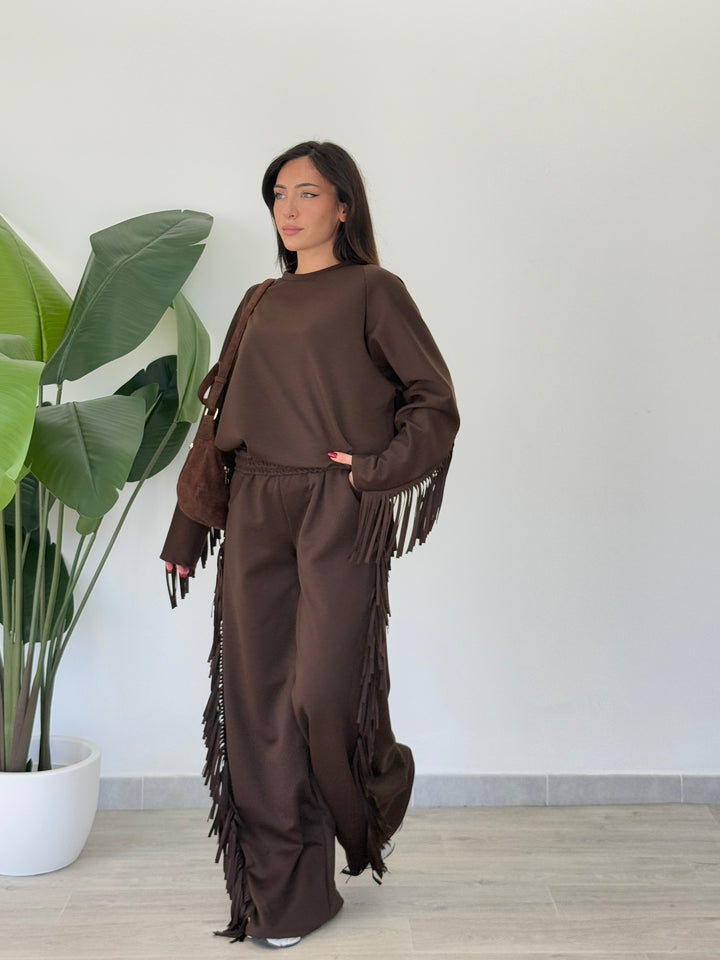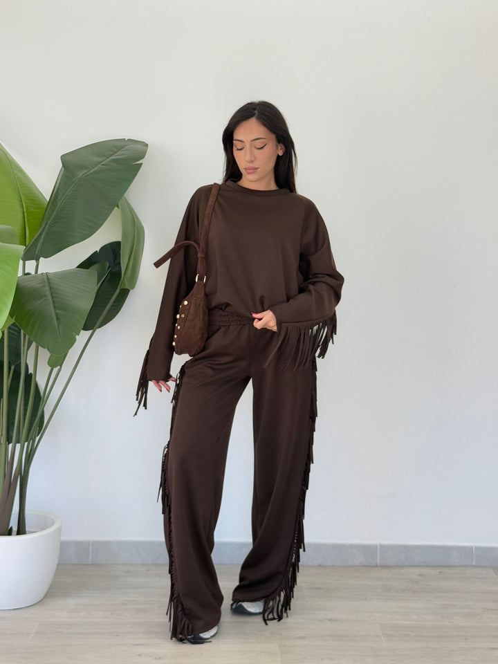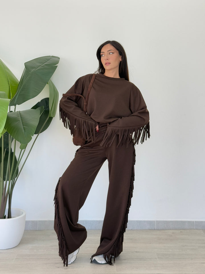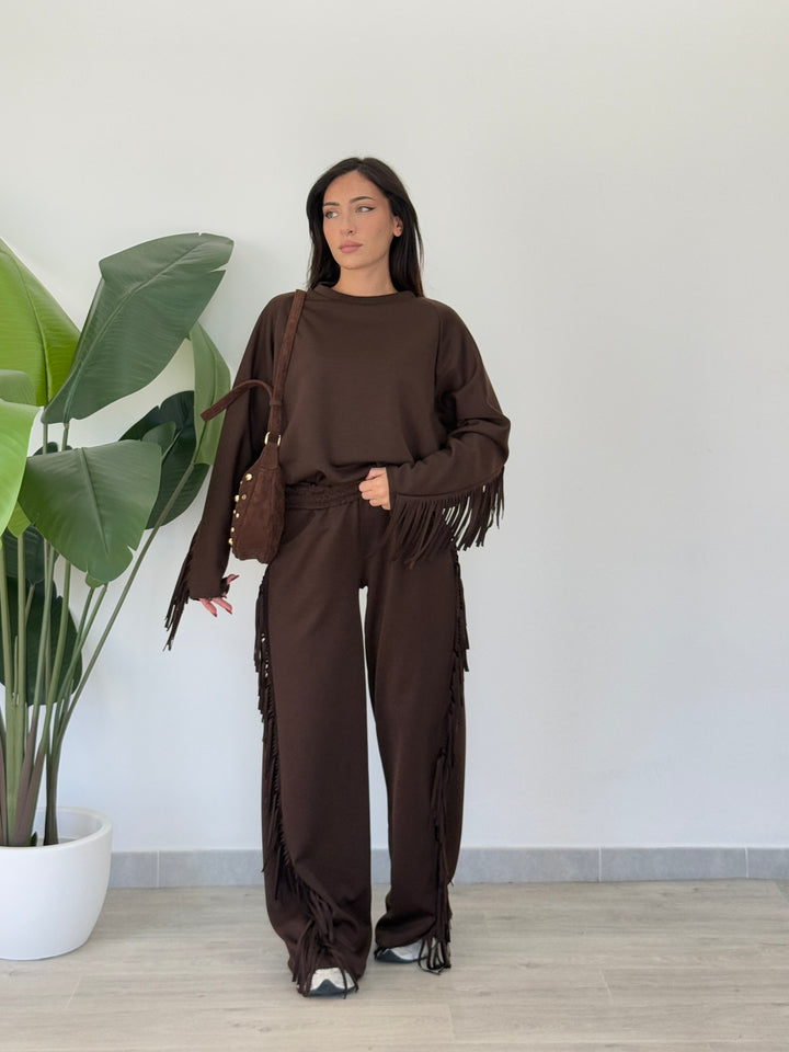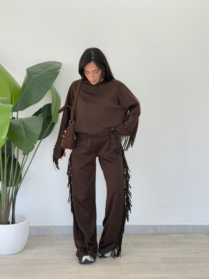 Scopri la magnifica tuta Frange . Coordinato composto da felpa con frange alla maniche e sul retro , pantalone con elastico in vita e frange laterali , modello wide leg e due tasche . Comoda e versatile perfetta per la tua quotidianità. Vestibilità elasticizzata