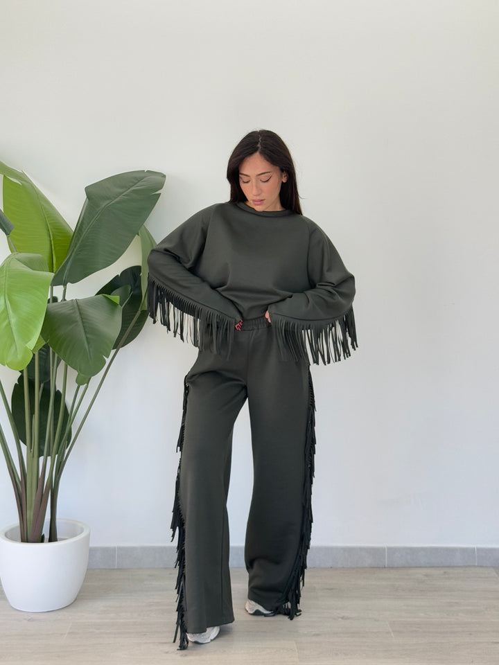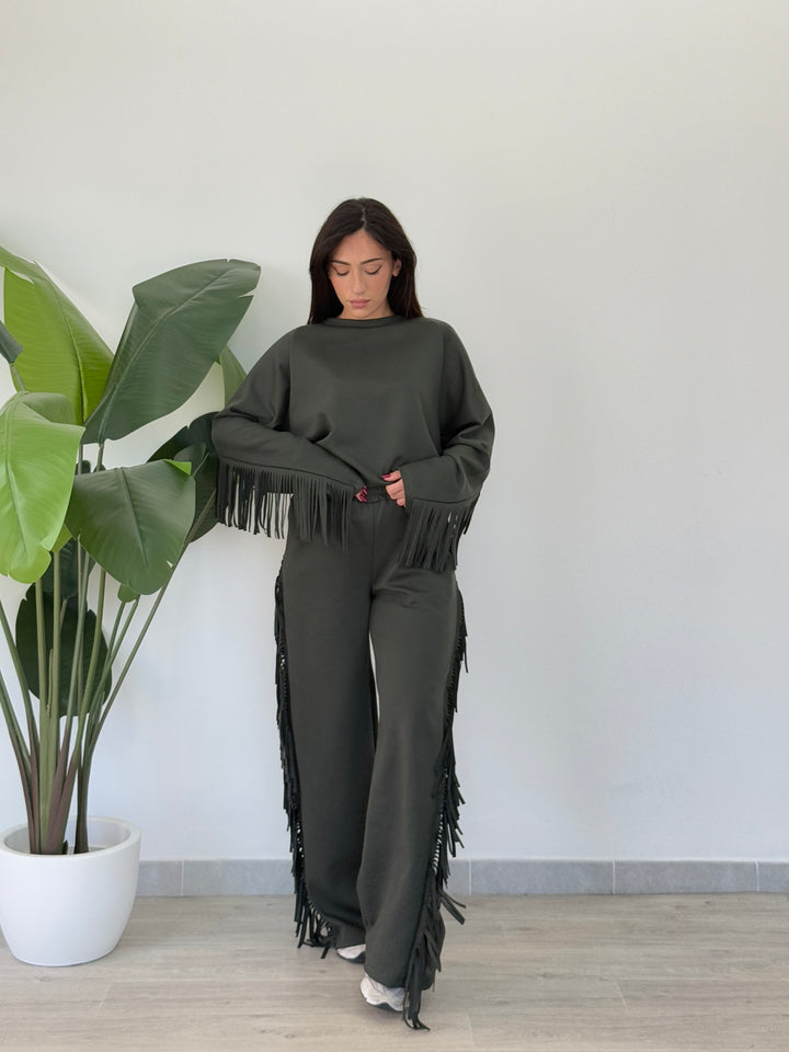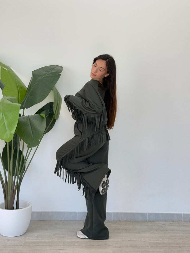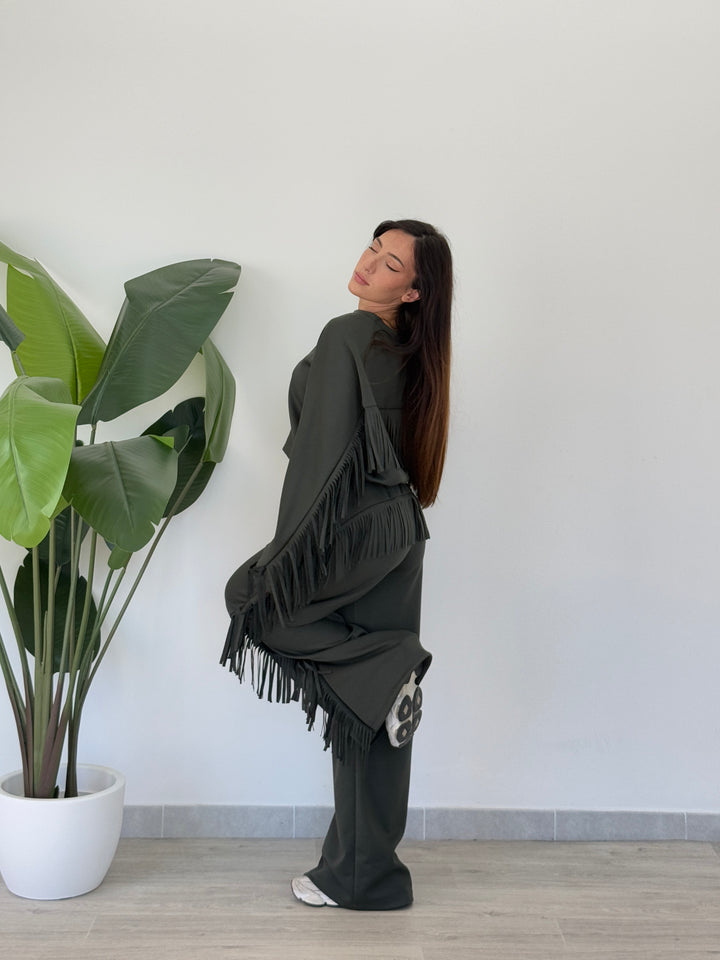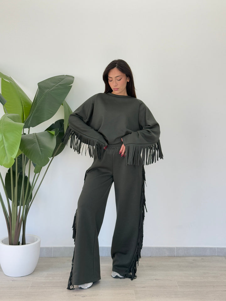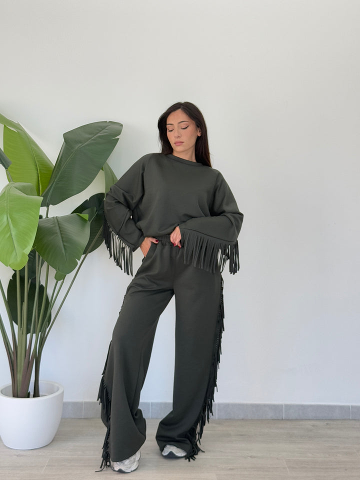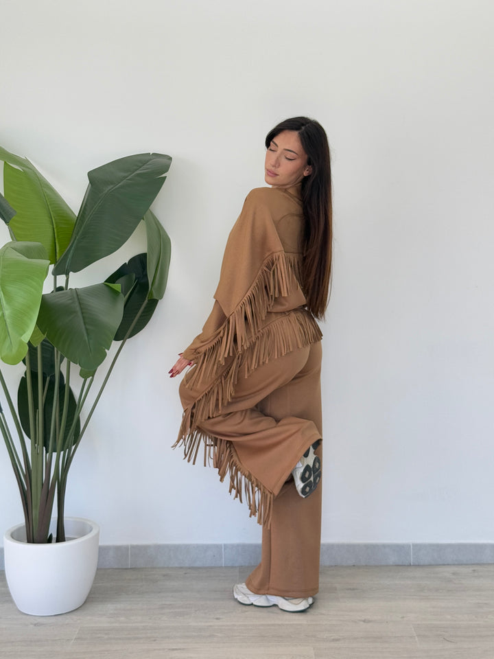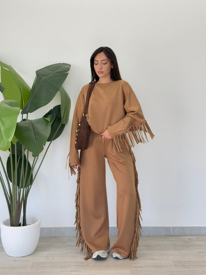 Scopri la magnifica tuta Frange . Coordinato composto da felpa con frange alla maniche e sul retro , pantalone con elastico in vita e frange laterali , modello wide leg e due tasche . Comoda e versatile perfetta per la tua quotidianità. Vestibilità elasticizzata