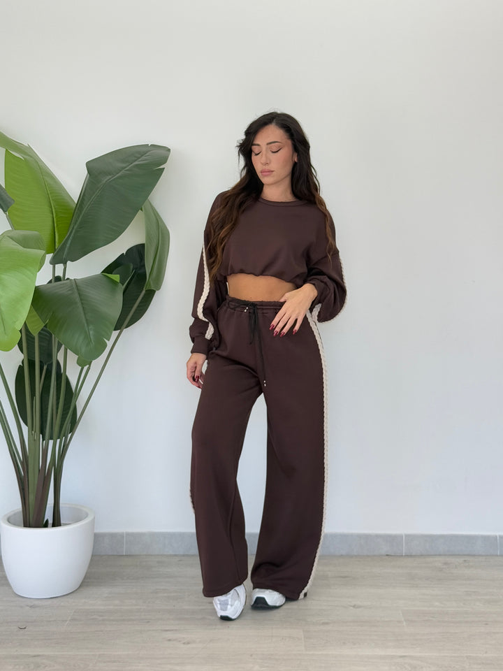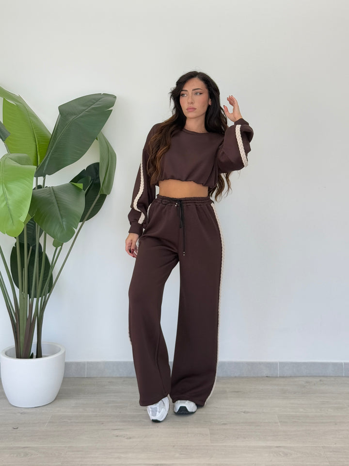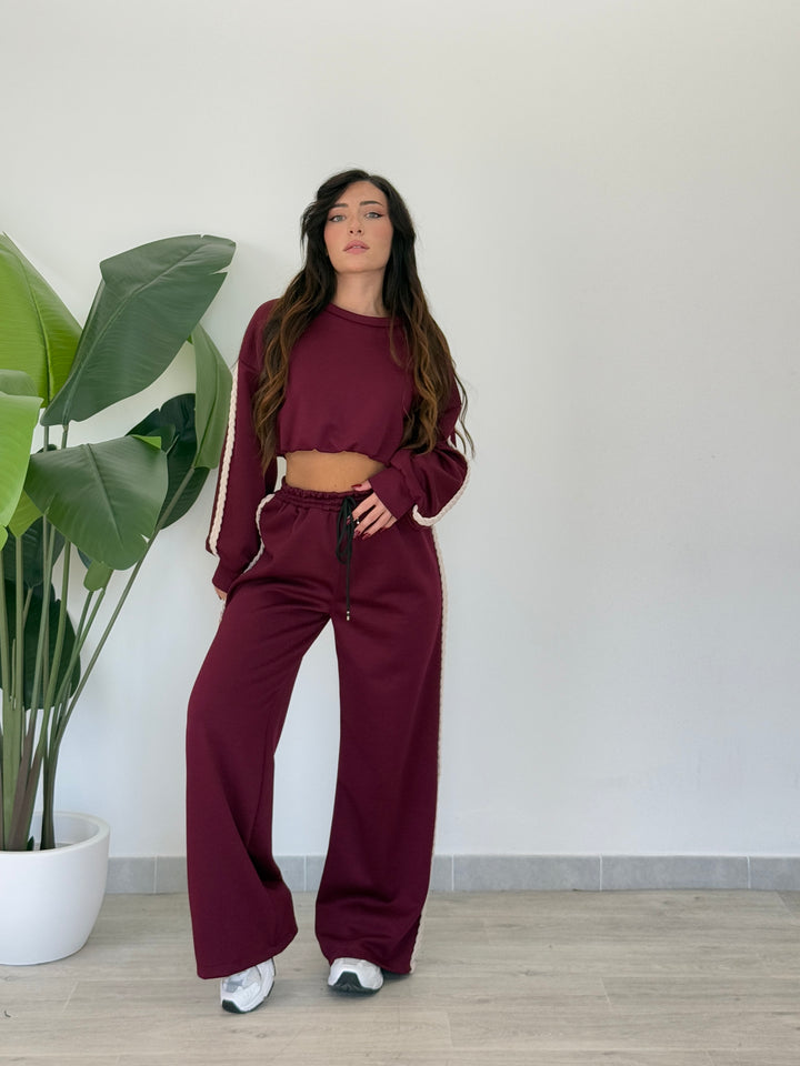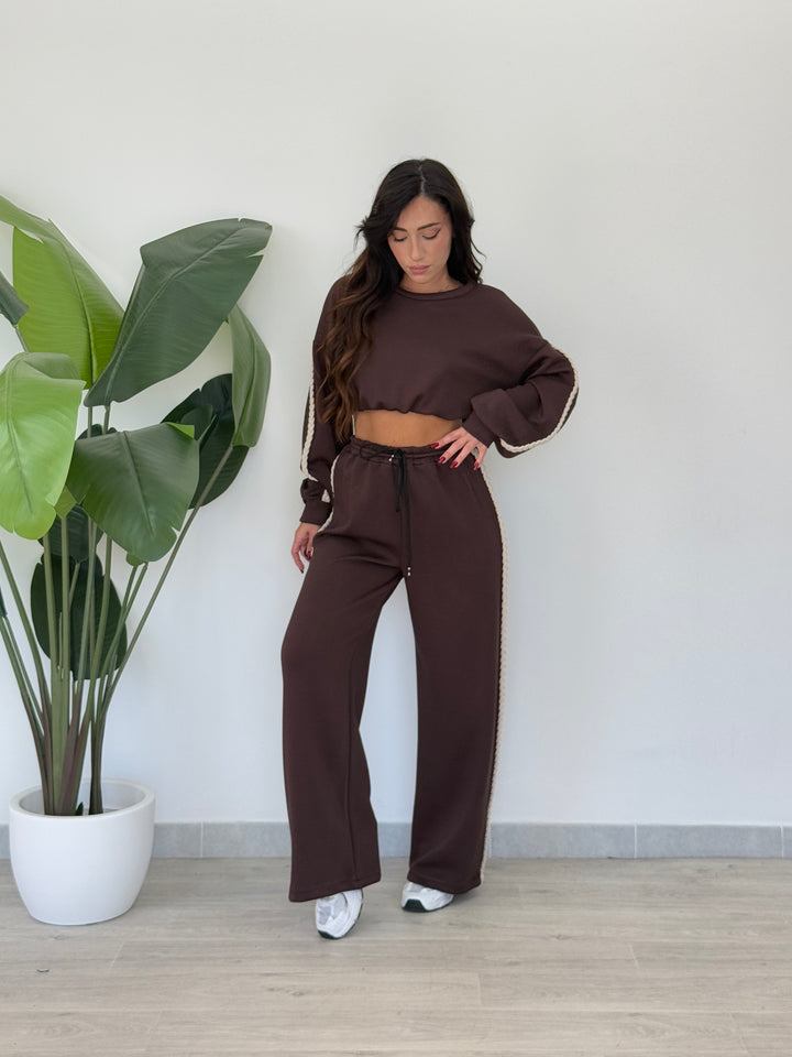 Scopri la magnifica tuta Treccina . Coordinato composto da felpa crop con elastico in vita , pantalone con elastico e coulisse in vita regolabile, modello wide leg . Comoda e versatile perfetta per la tua quotidianità. Vestibilità elasticizzata