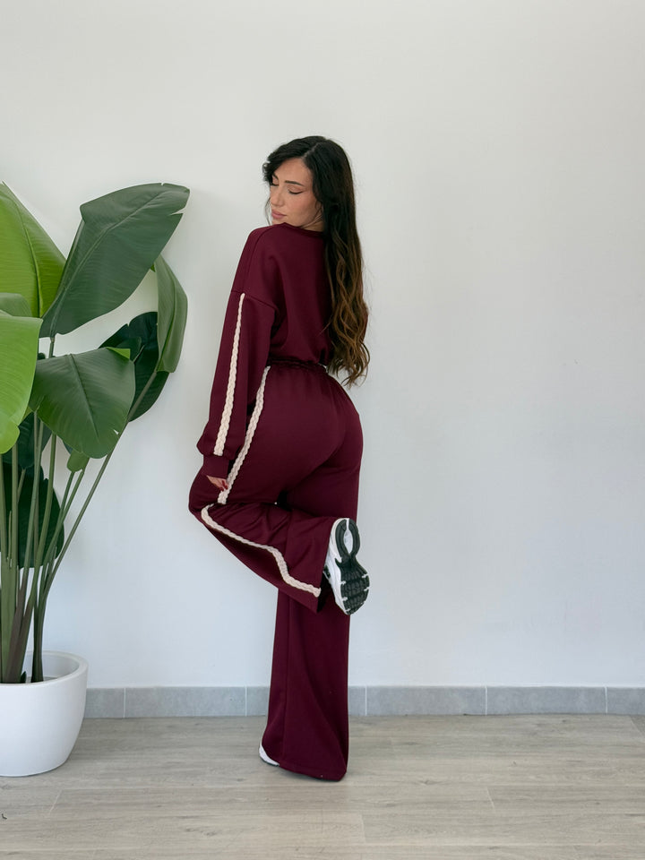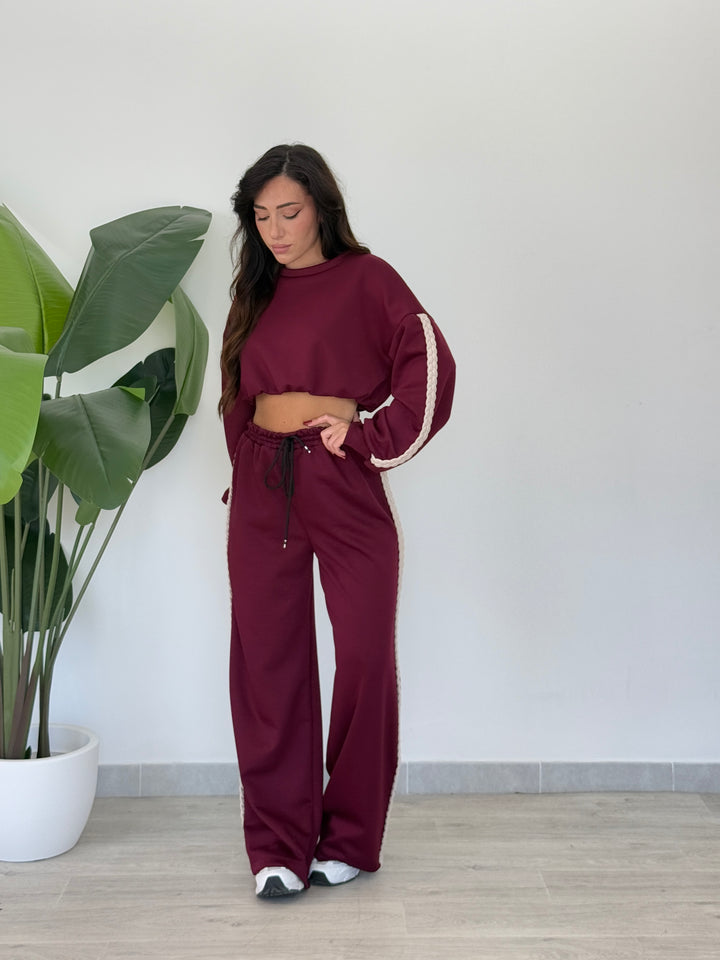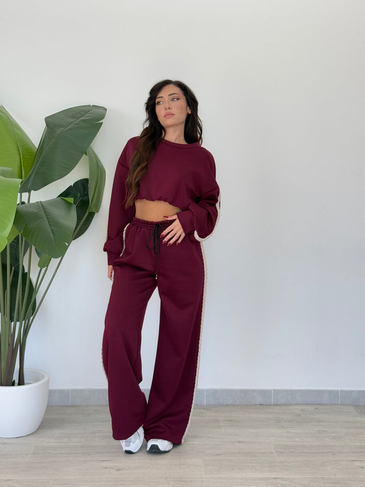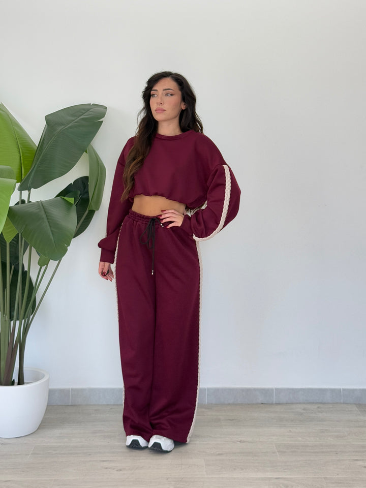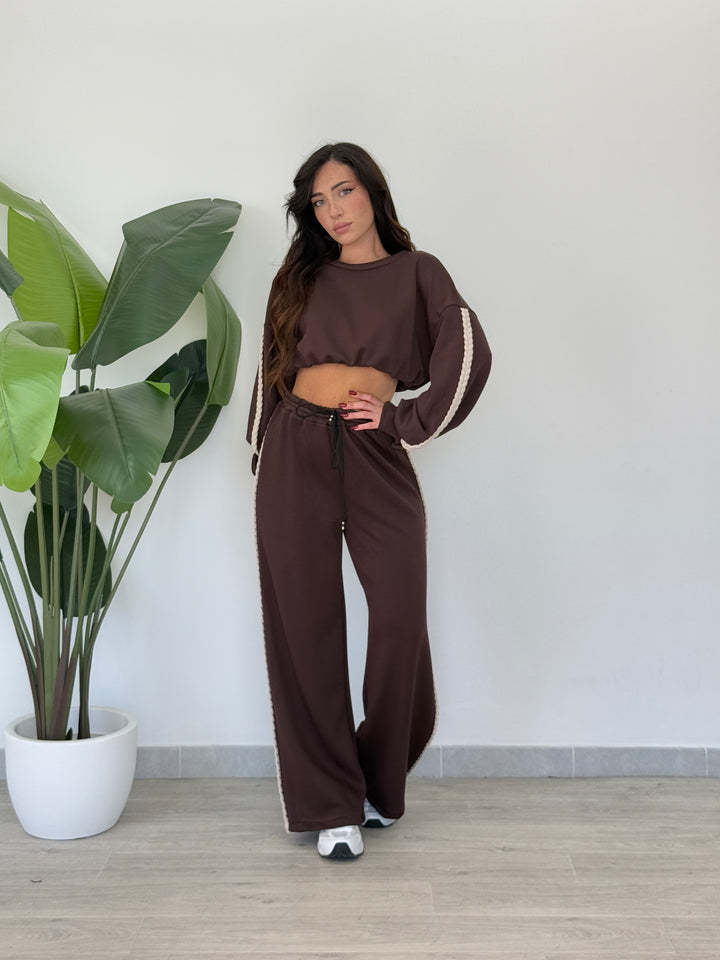 Scopri la magnifica tuta Treccina . Coordinato composto da felpa crop con elastico in vita , pantalone con elastico e coulisse in vita regolabile, modello wide leg . Comoda e versatile perfetta per la tua quotidianità. Vestibilità elasticizzata